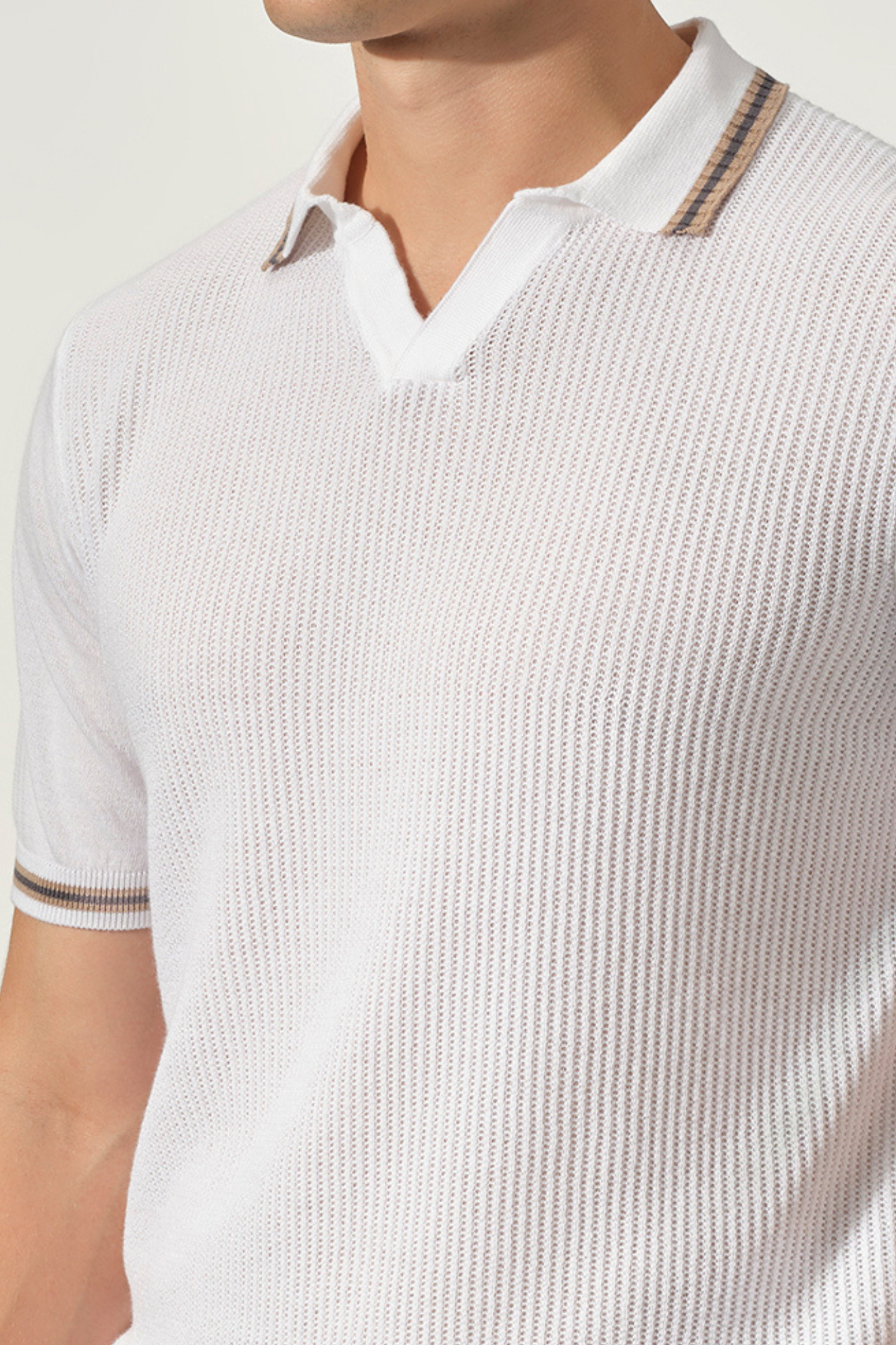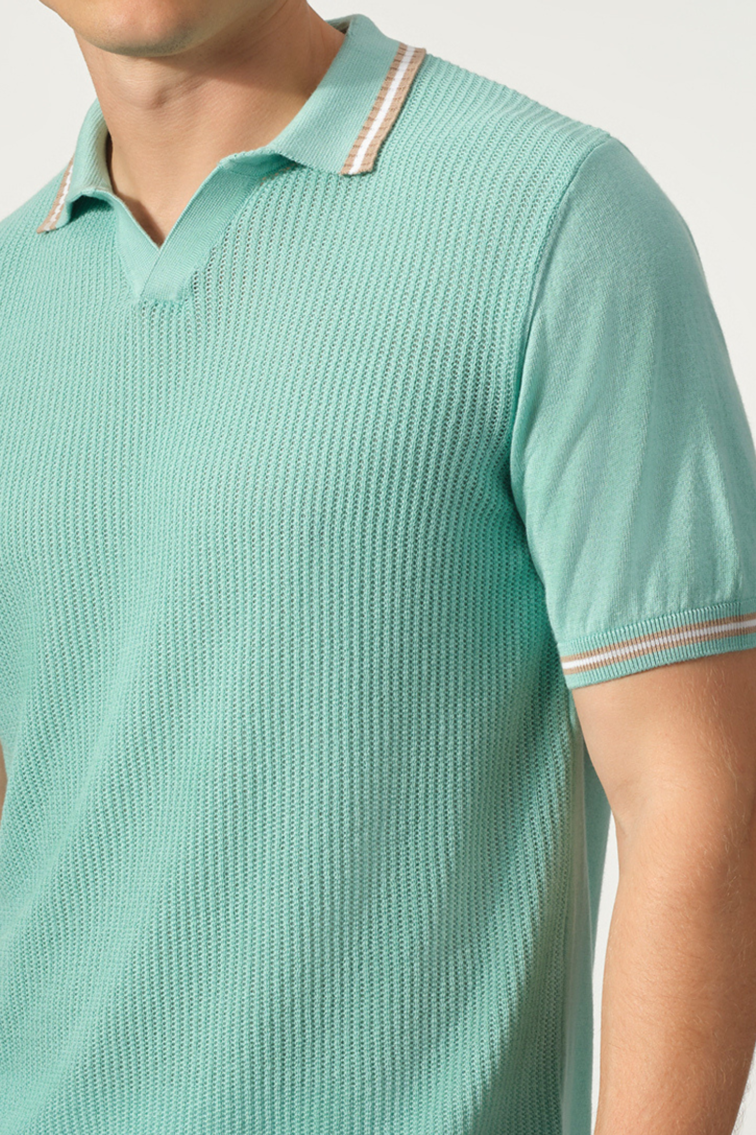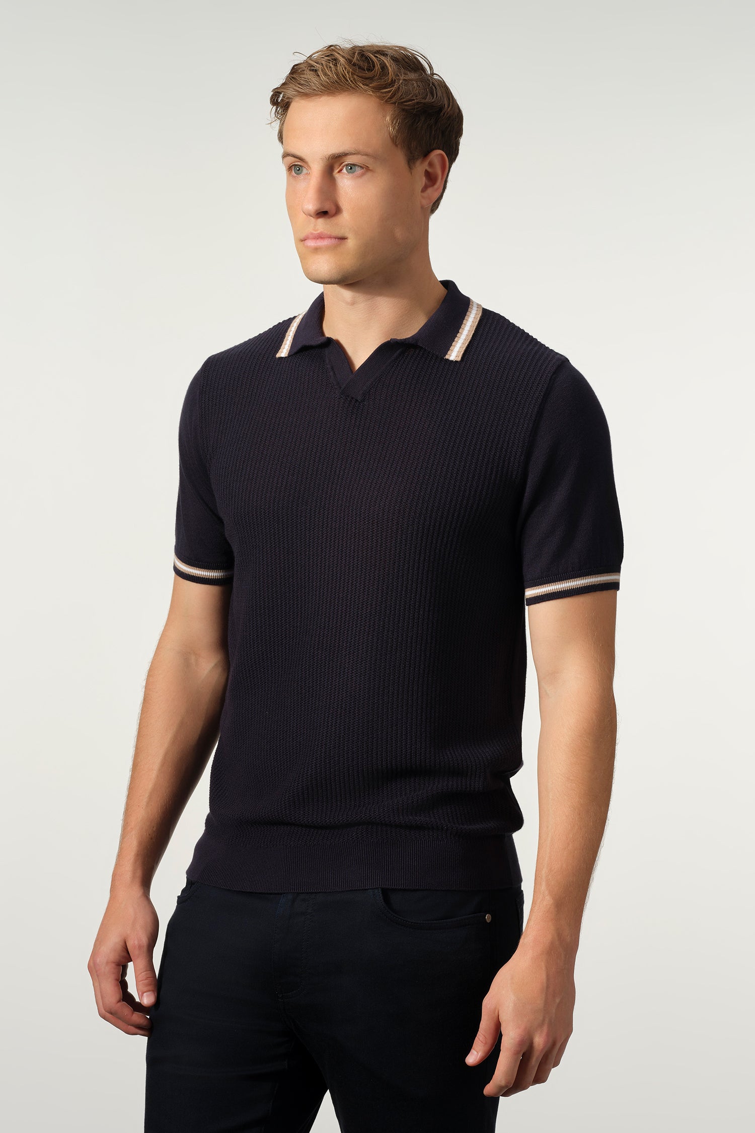 A refined update to a classic silhouette, the Open Collar Textured Polo is designed for effortless versatility and elevated comfort. Crafted from a breathable cotton-Tencel blend, it features a soft, lightweight knit with a subtle textured finish that adds depth without compromising its clean look. The open collar lends a relaxed yet polished feel, while the contrast stripe detailing on the collar and sleeves brings a touch of understated character. Finished with a tailored fit, it pairs seamlessly with both casual and more refined pieces.