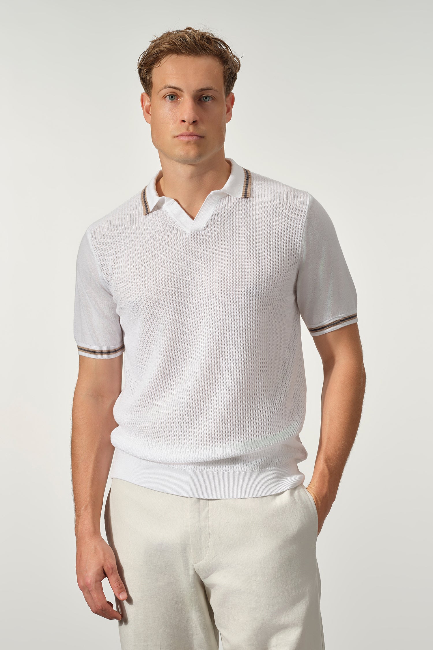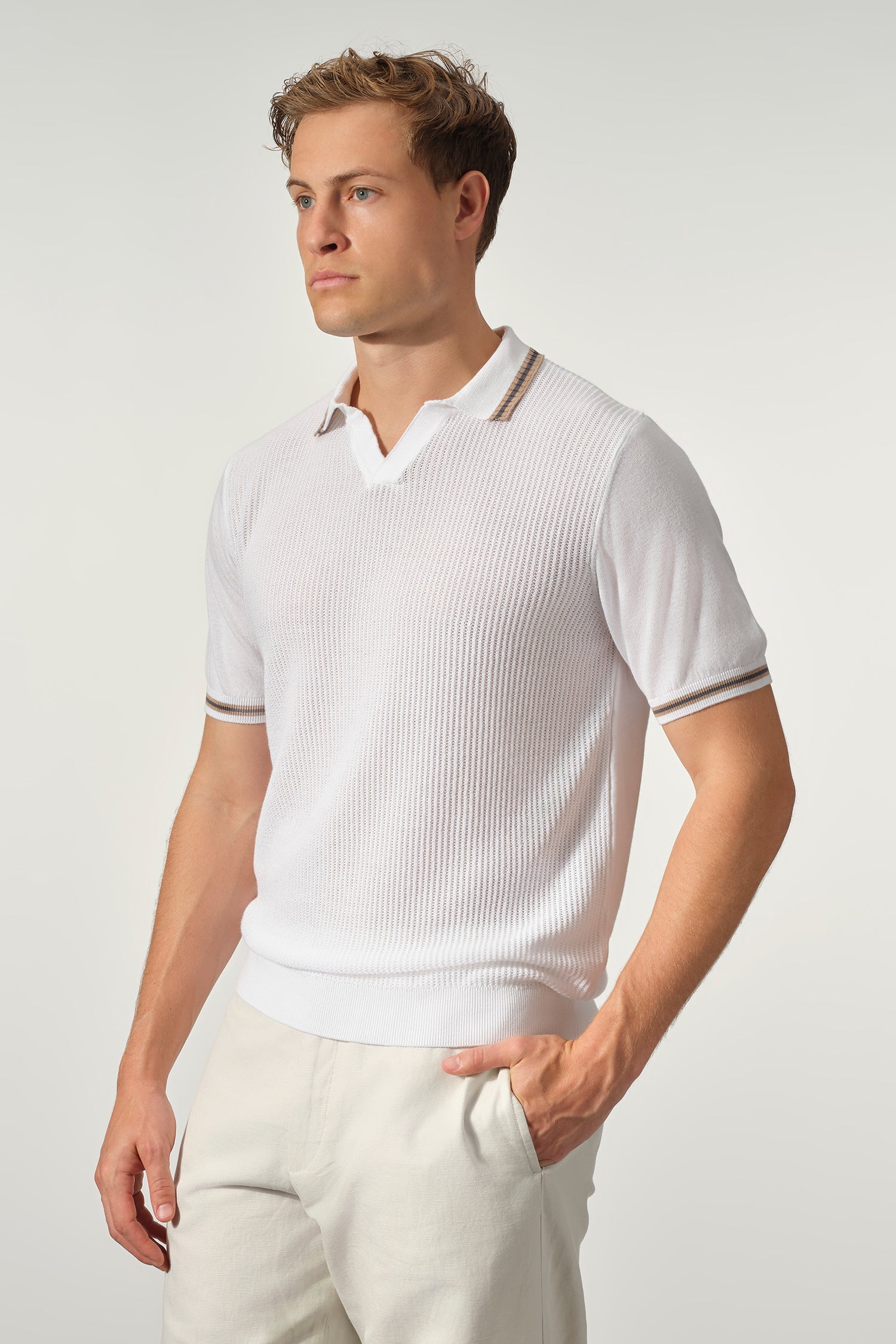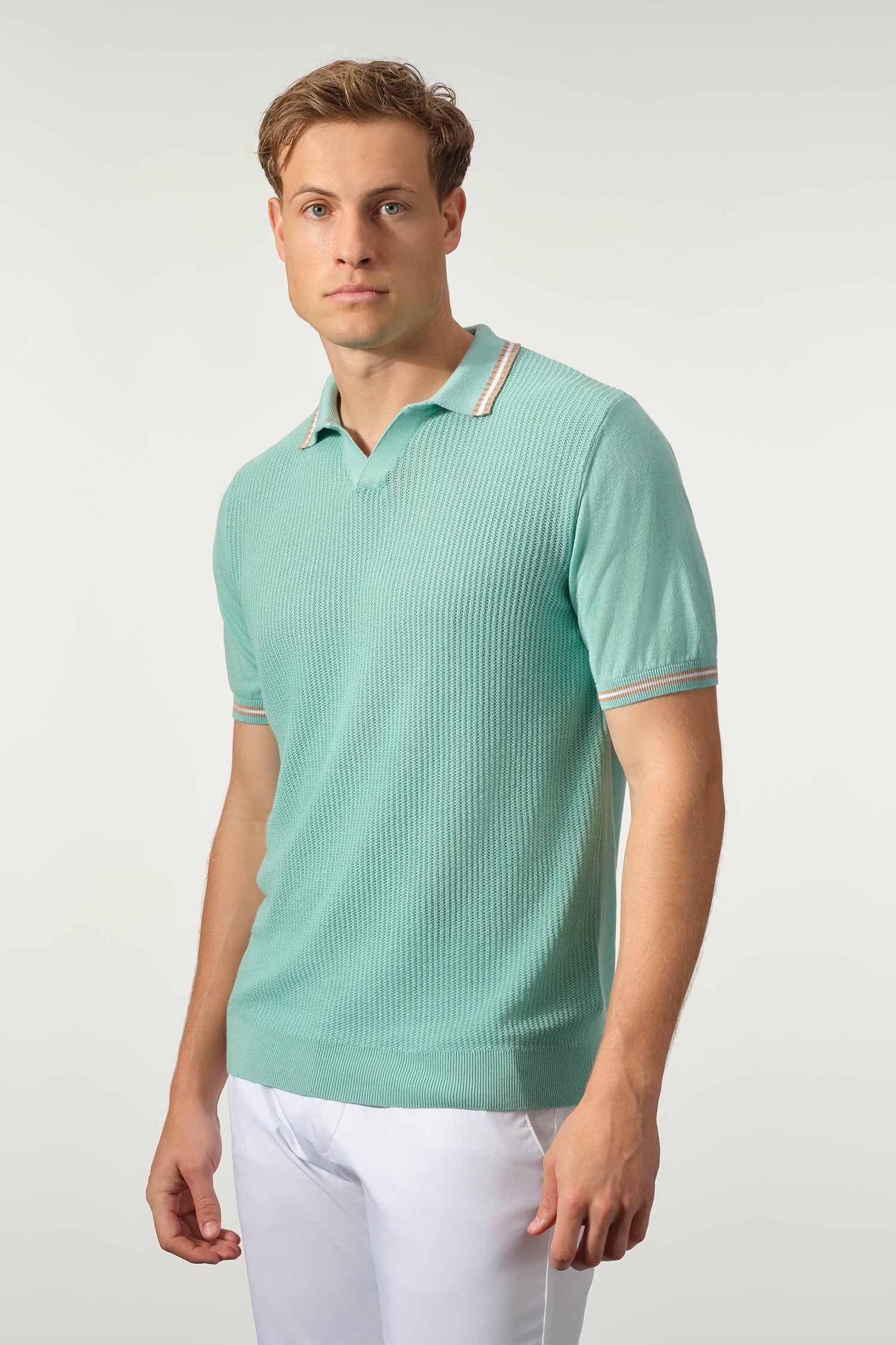 A refined update to a classic silhouette, the Open Collar Textured Polo is designed for effortless versatility and elevated comfort. Crafted from a breathable cotton-Tencel blend, it features a soft, lightweight knit with a subtle textured finish that adds depth without compromising its clean look. The open collar lends a relaxed yet polished feel, while the contrast stripe detailing on the collar and sleeves brings a touch of understated character. Finished with a tailored fit, it pairs seamlessly with both casual and more refined pieces.