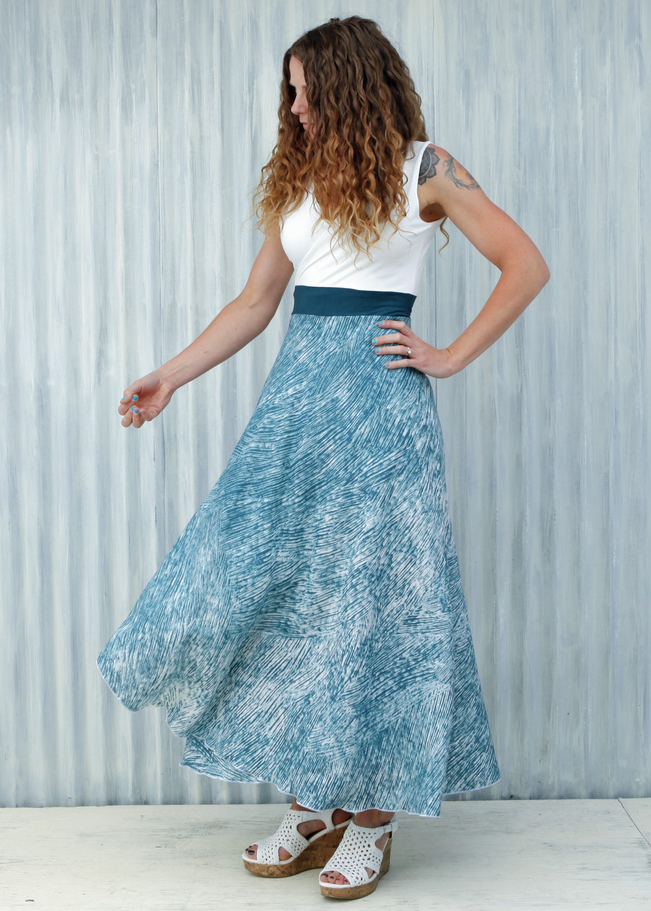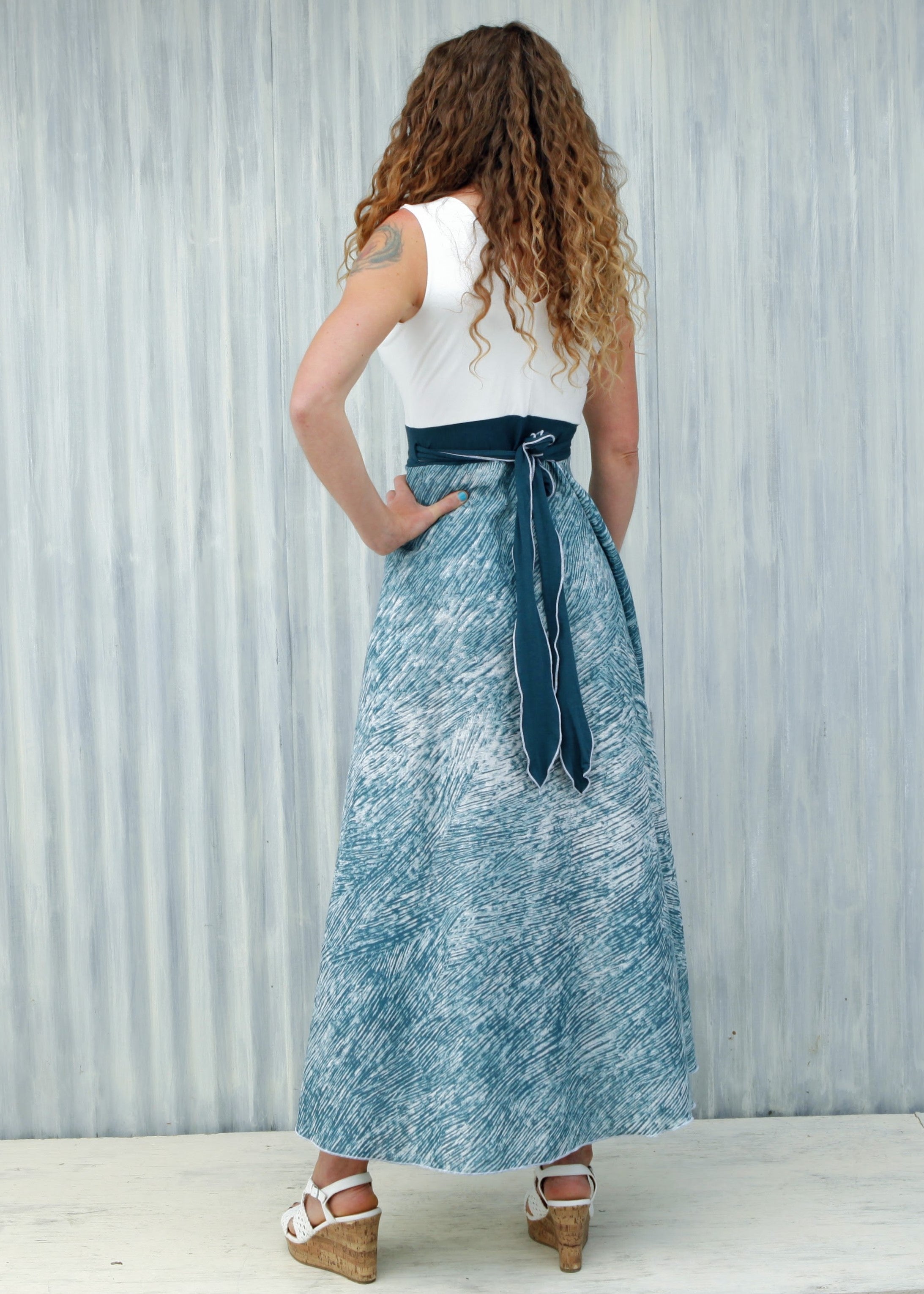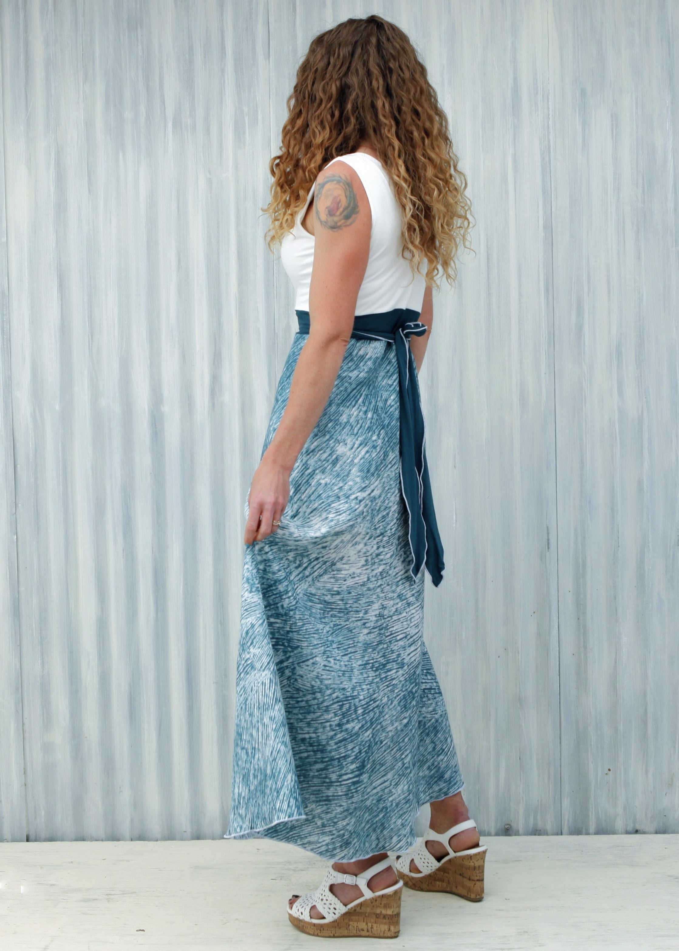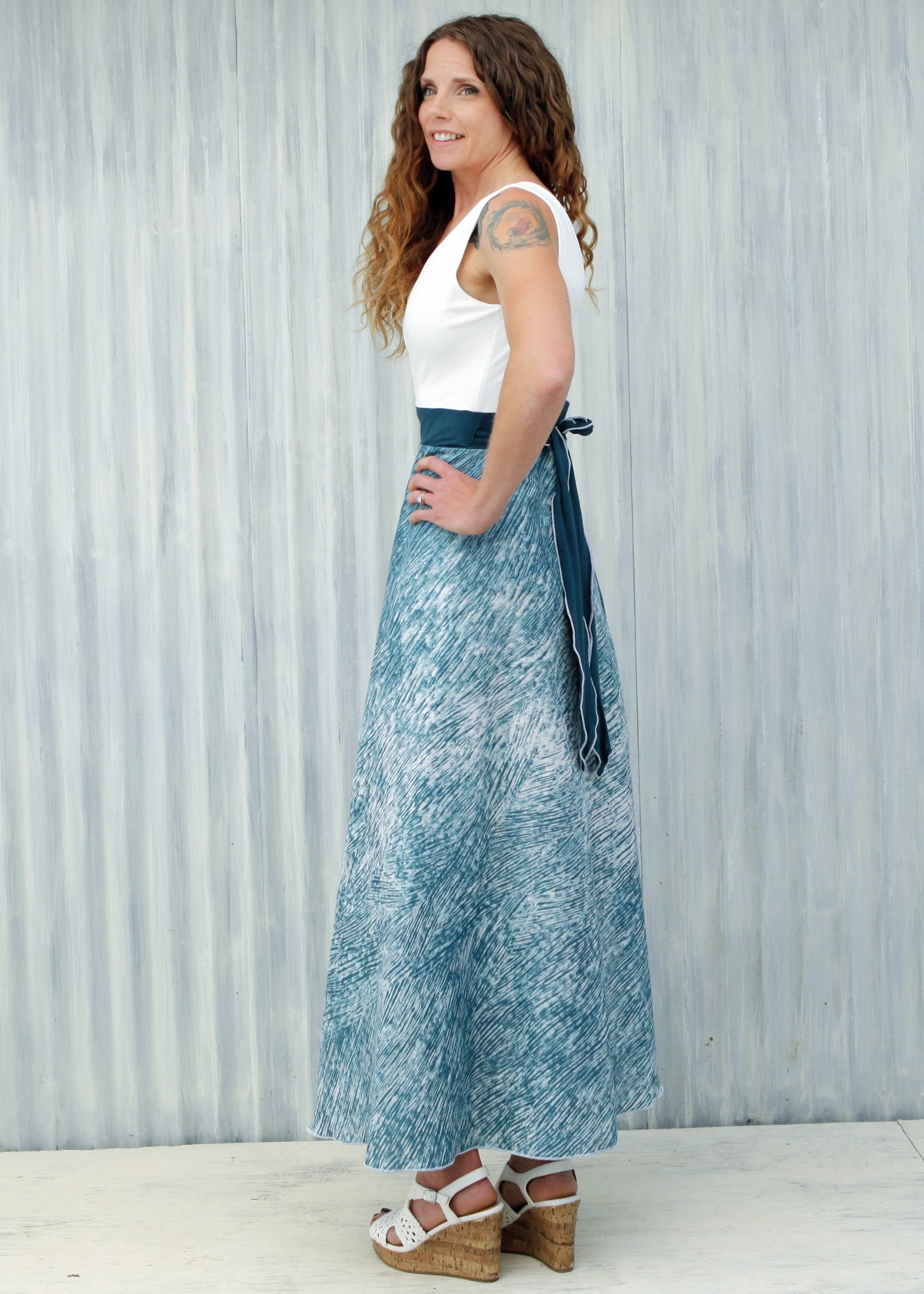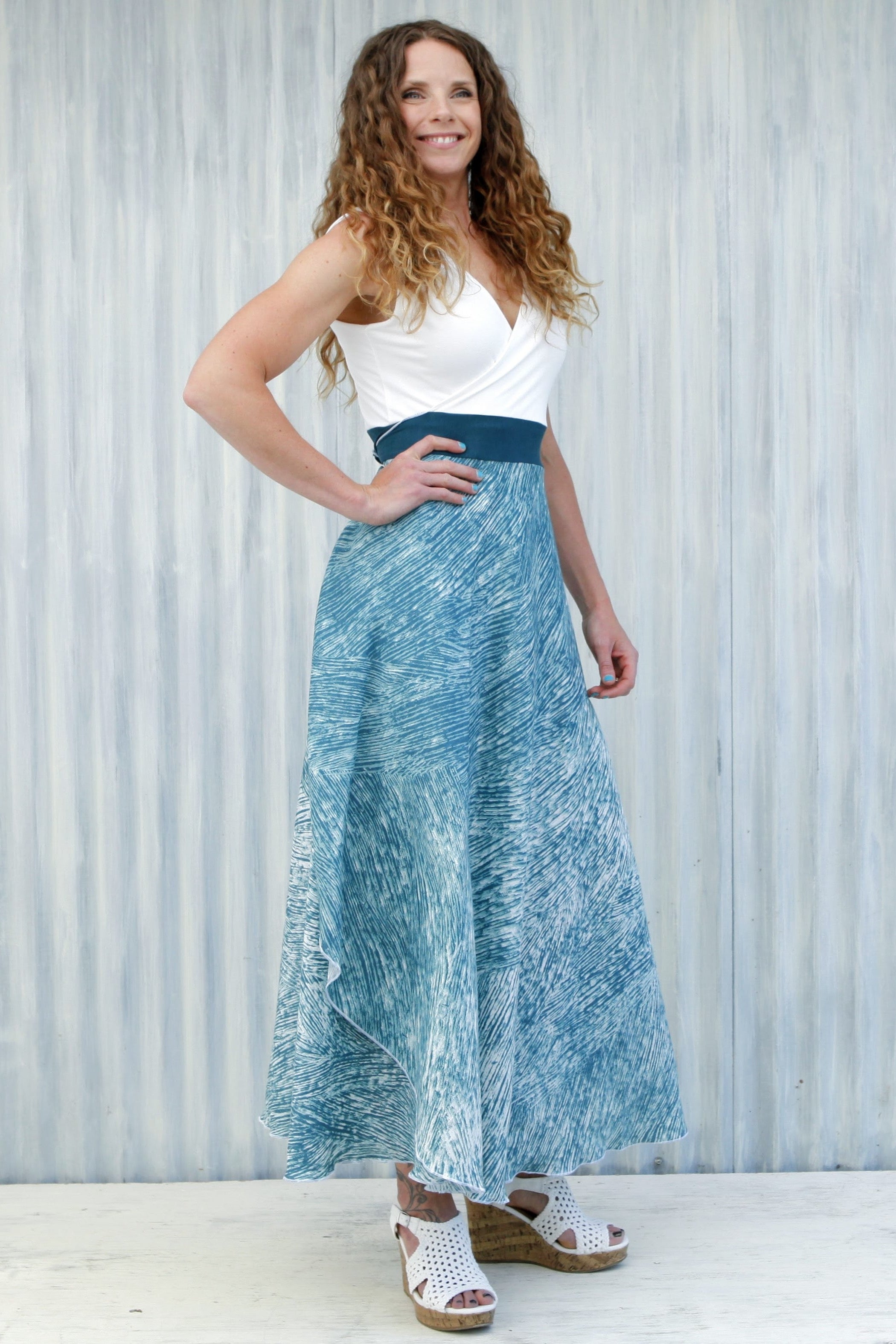 This dress is a show-stopper! Made for summer celebrations, the airy Aquarius Wrap Dress is a perfect choice for special occasions like weddings, anniversaries, birthdays, or fancy family photos. With a flattering fit-and-flare design, this long dress is both elegant and comfortable. The top is so soft, and the skirt has a beautiful pattern that is just busy enough to help hide wrinkles.