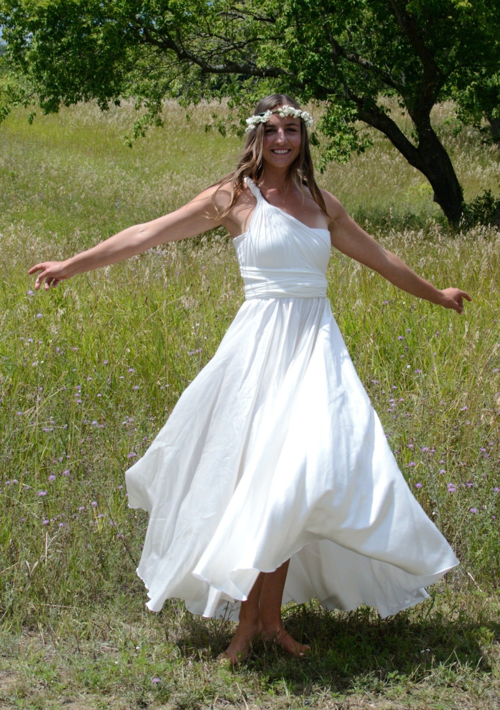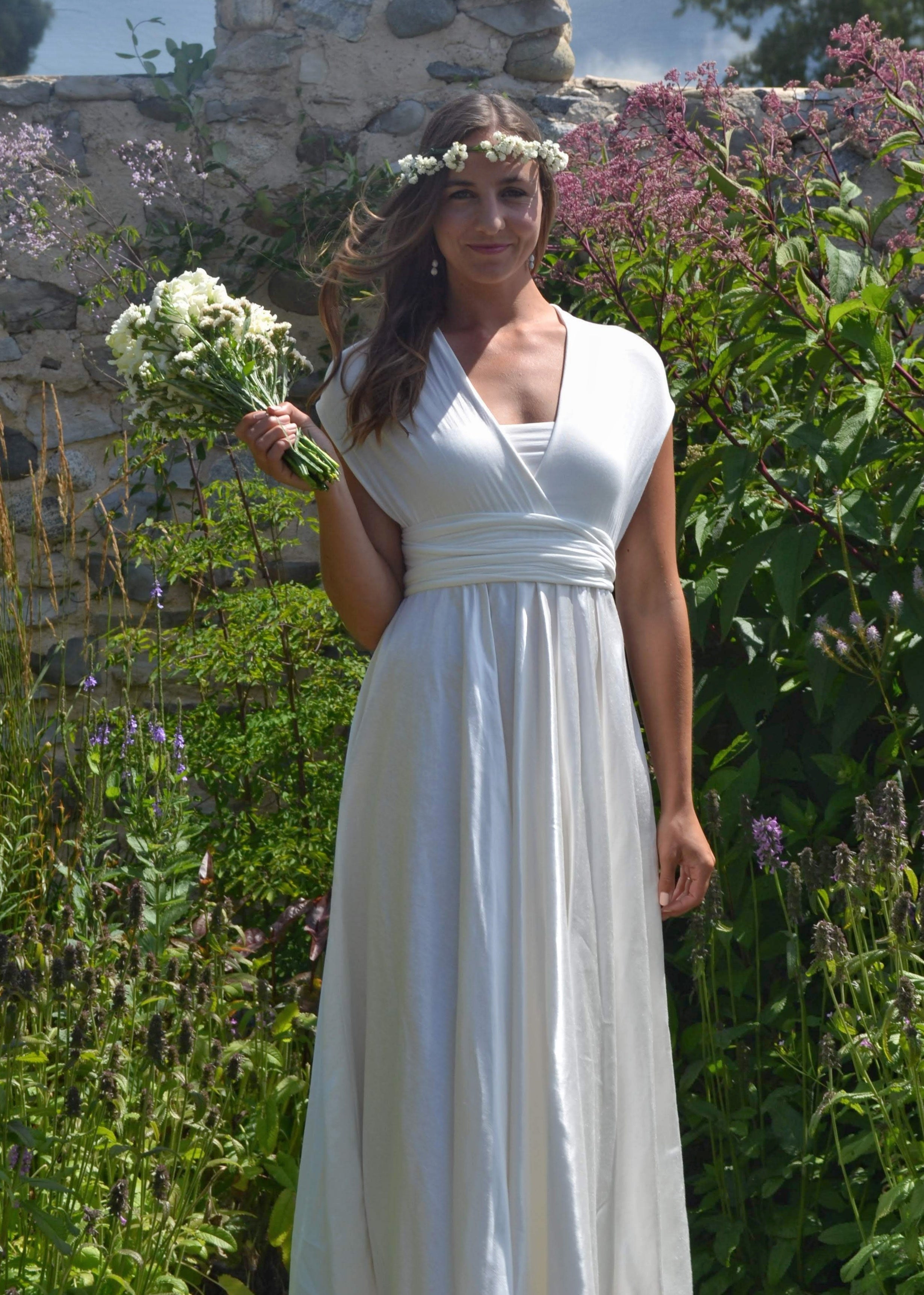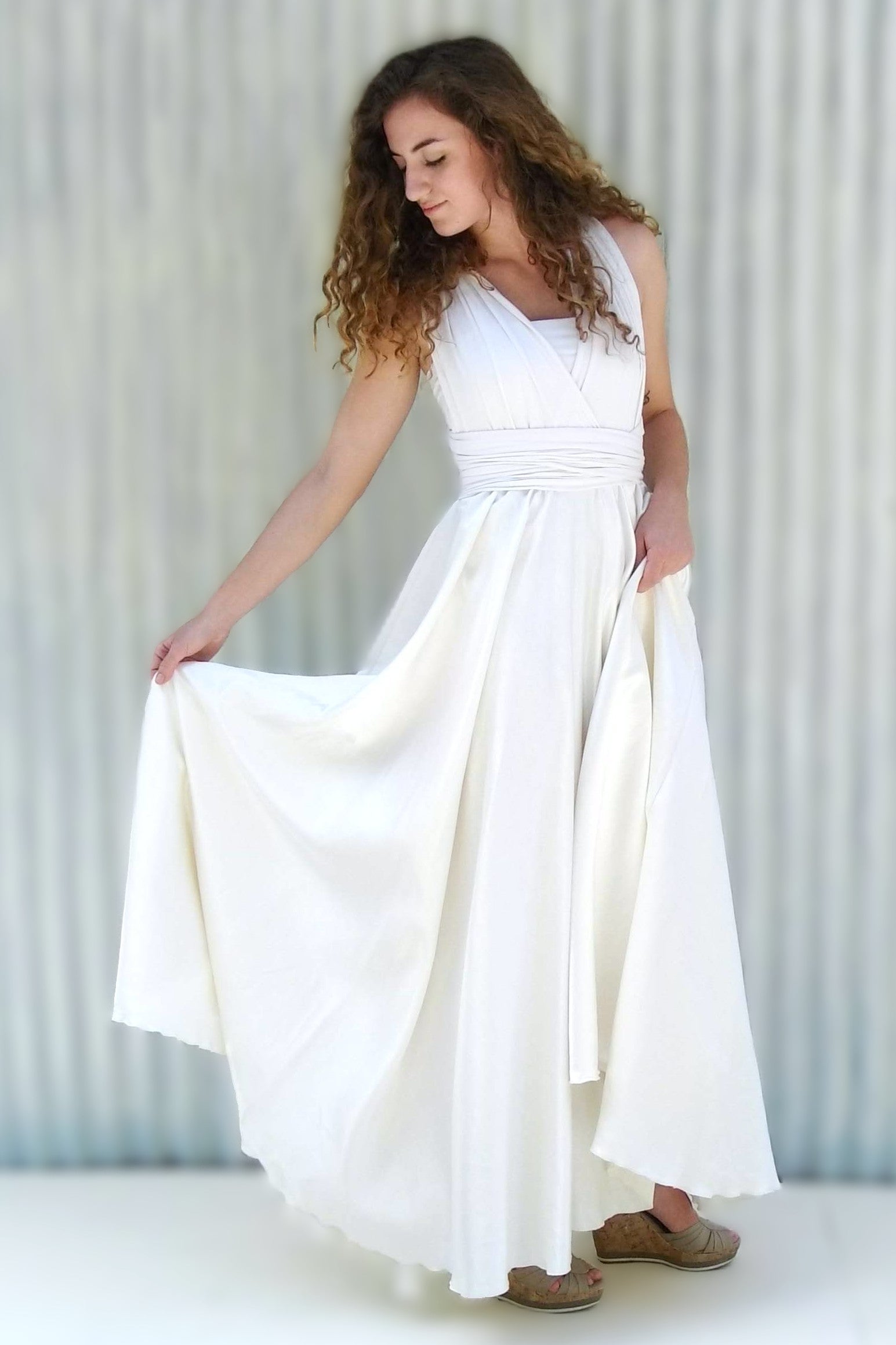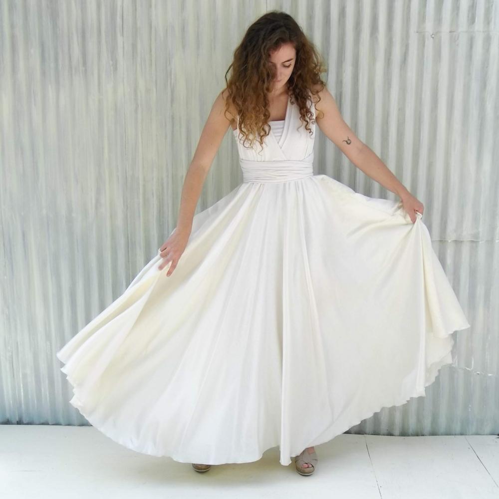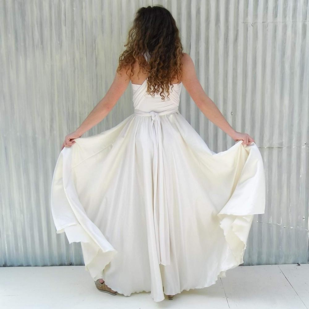 Oh my, this dress feels so good., it brought tears to my eyes the first time I tried it on. This dress hugs and wraps your body in soft sumptuous beauty on top, and flows with grace through the bottom. This dress is cut very generously to provide maximum versatility and comfort. The long infinity straps can be wrapped in many different styles, perfect for transitioning from service to reception. It also has an added unique lined bust under-layer to provide support and confidence so that you can dance and move freely. So many ways to wear this dress and sure to bring joy to your special day. This floor length silk wedding dress can be arranged in cap sleeves, cross back, twisted down the back, and so many other ways. The skirt on this dress is so full and flowing.