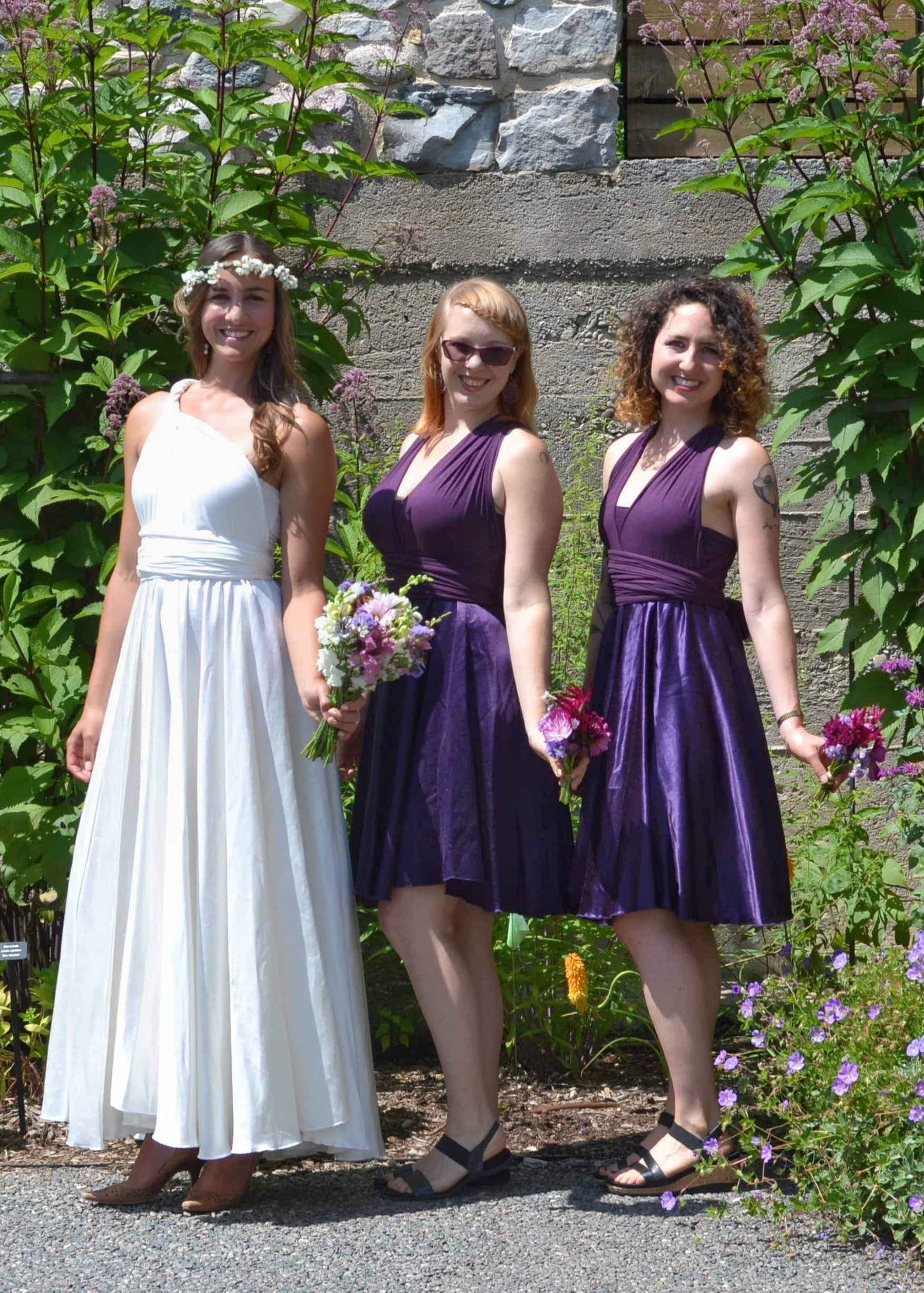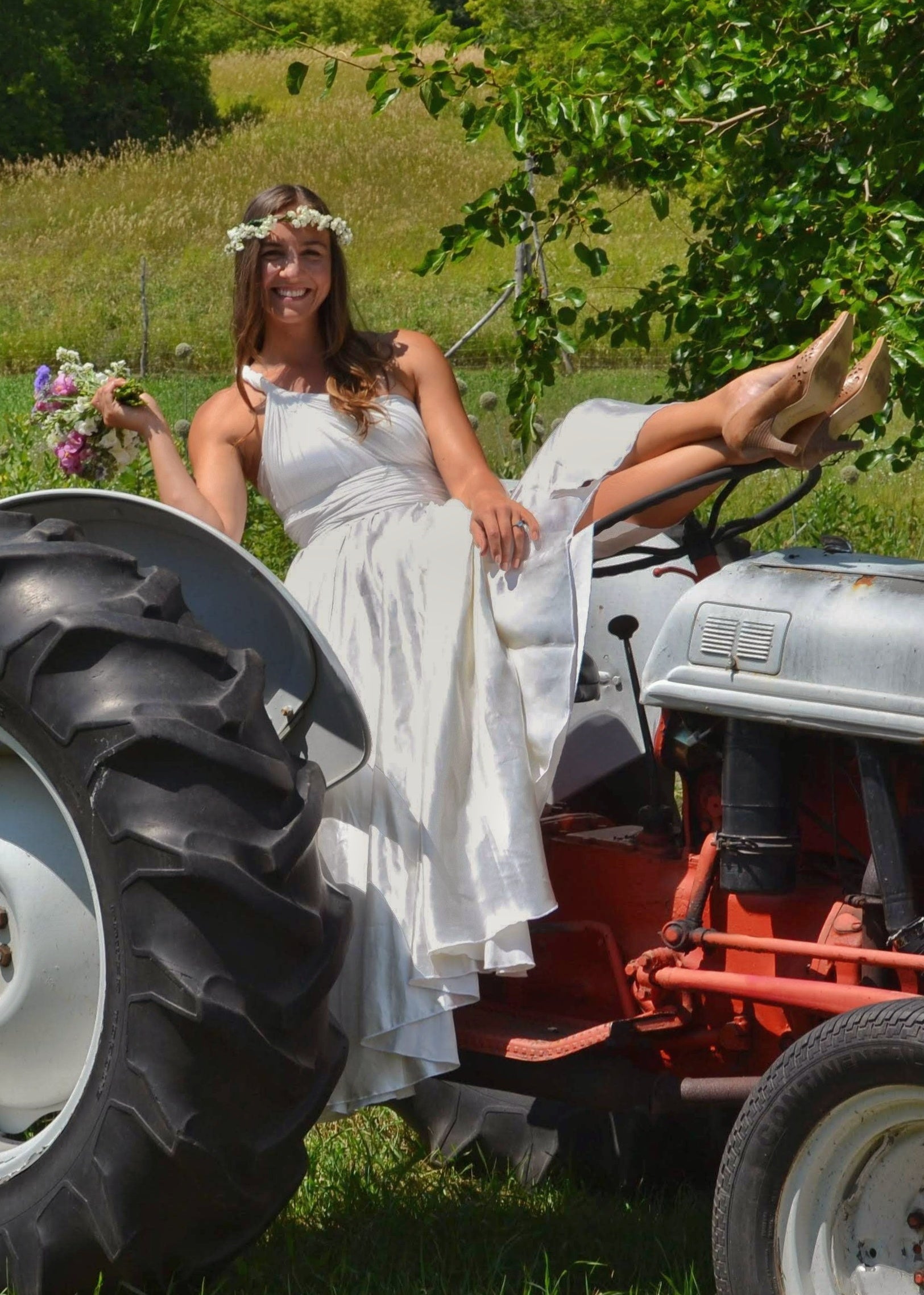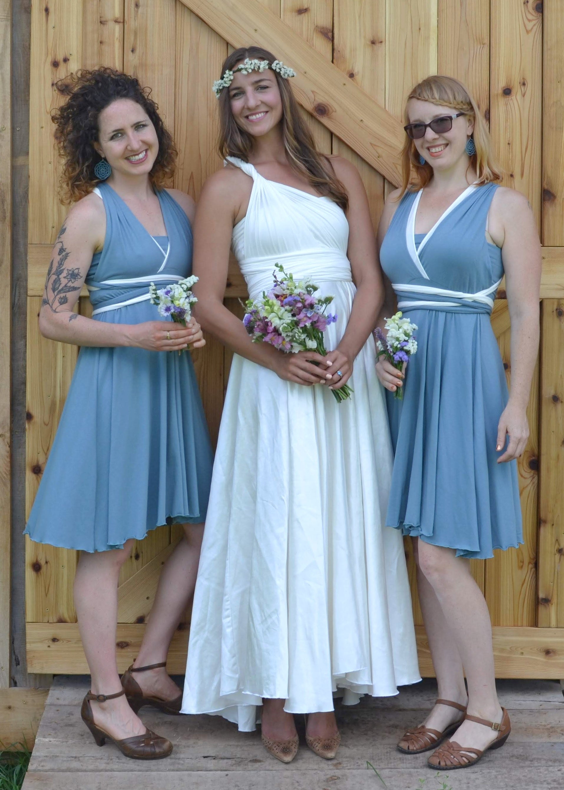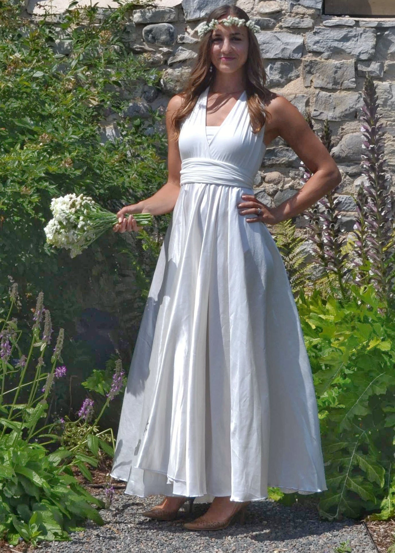 Oh my, this dress feels so good., it brought tears to my eyes the first time I tried it on. This dress hugs and wraps your body in soft sumptuous beauty on top, and flows with grace through the bottom. This dress is cut very generously to provide maximum versatility and comfort. The long infinity straps can be wrapped in many different styles, perfect for transitioning from service to reception. It also has an added unique lined bust under-layer to provide support and confidence so that you can dance and move freely. So many ways to wear this dress and sure to bring joy to your special day. This floor length silk wedding dress can be arranged in cap sleeves, cross back, twisted down the back, and so many other ways. The skirt on this dress is so full and flowing.