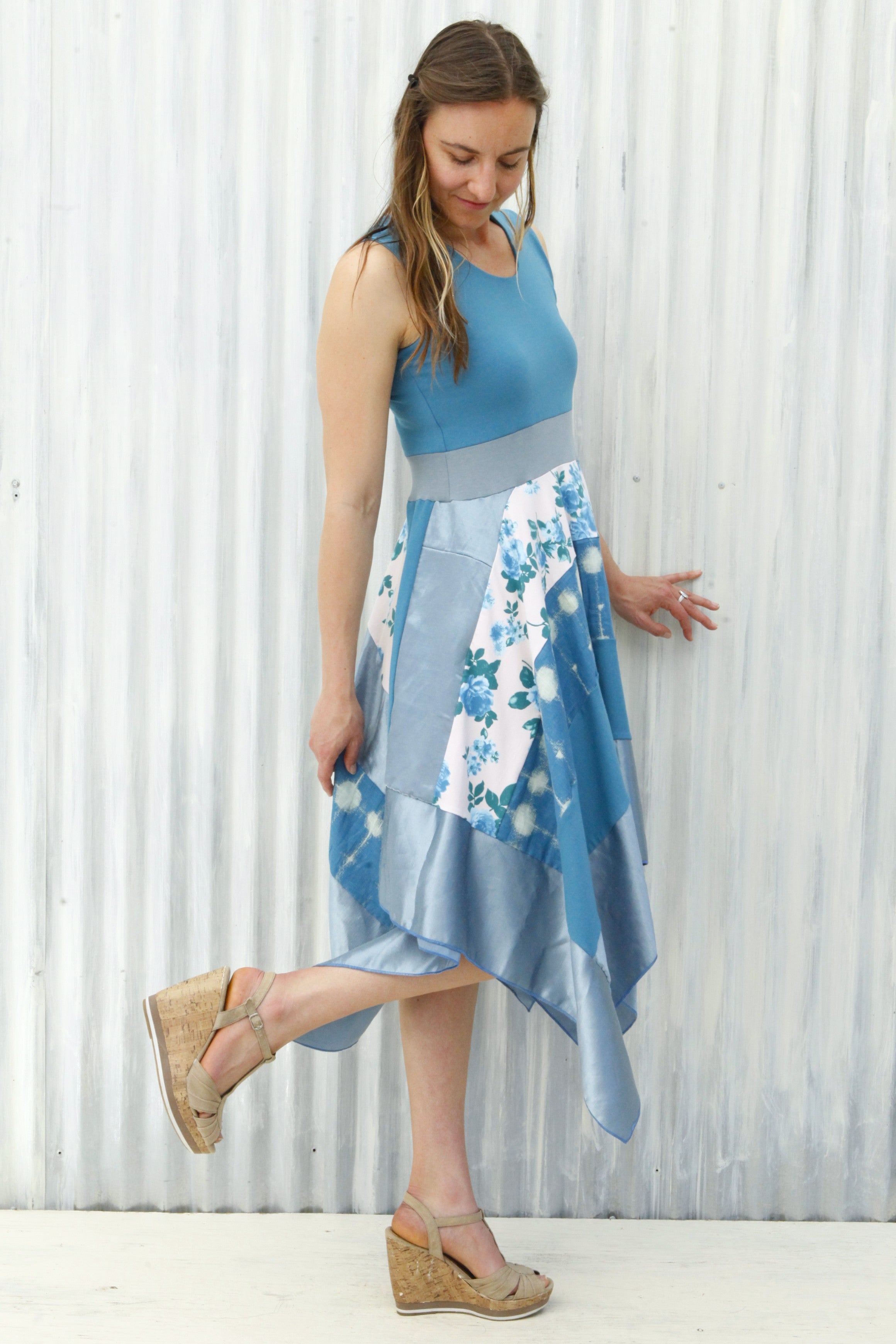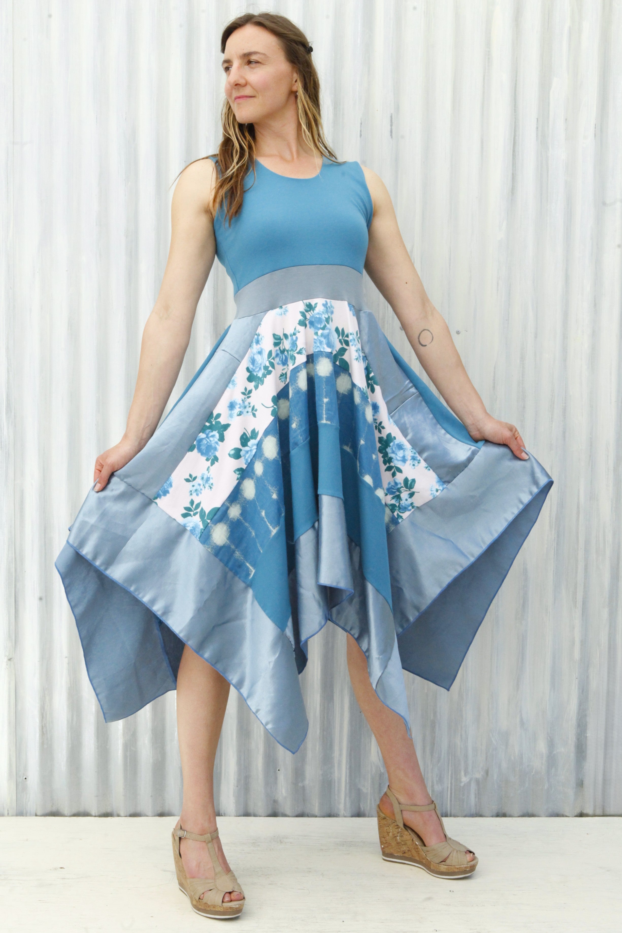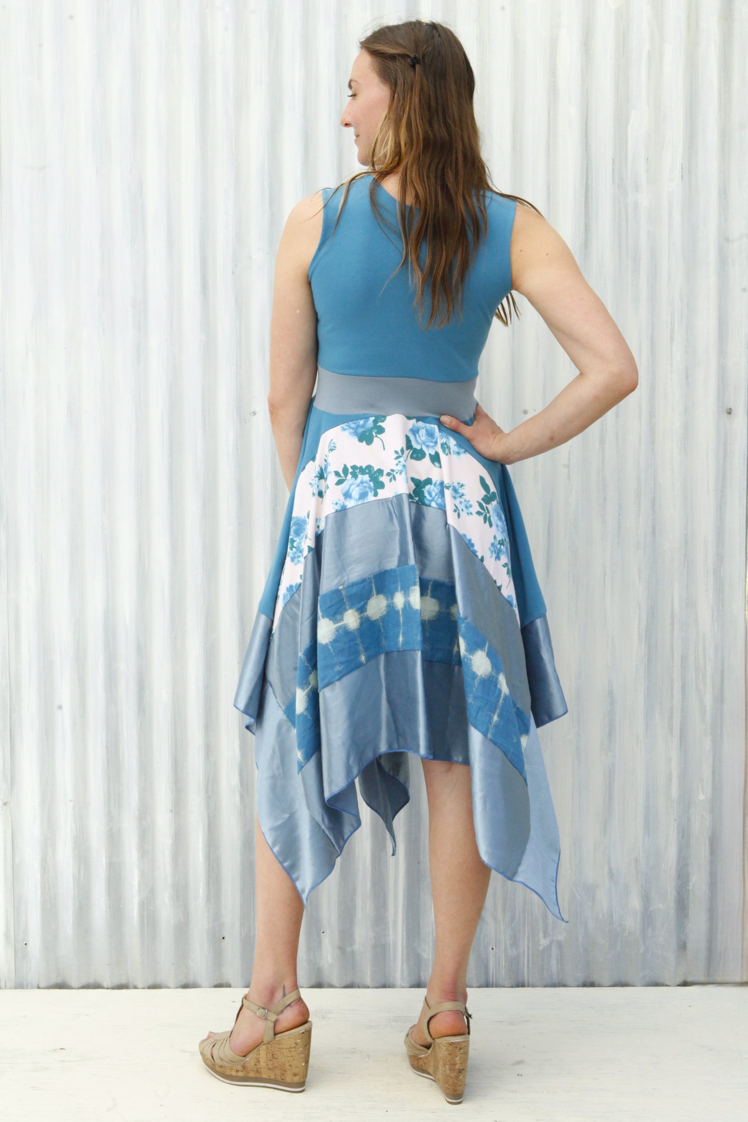 - Salvaged Cotton Jersey (Blue Rose print and solid Blue bodice fabric are rescued deadstock material, so exact fiber content is unknown- does contain spandex).