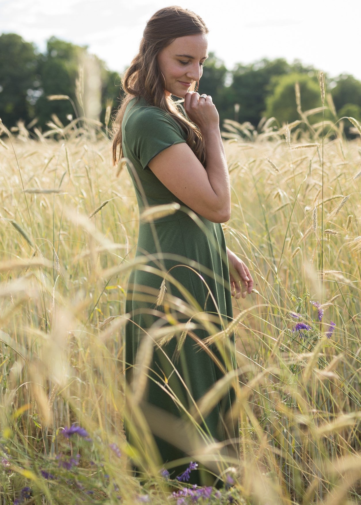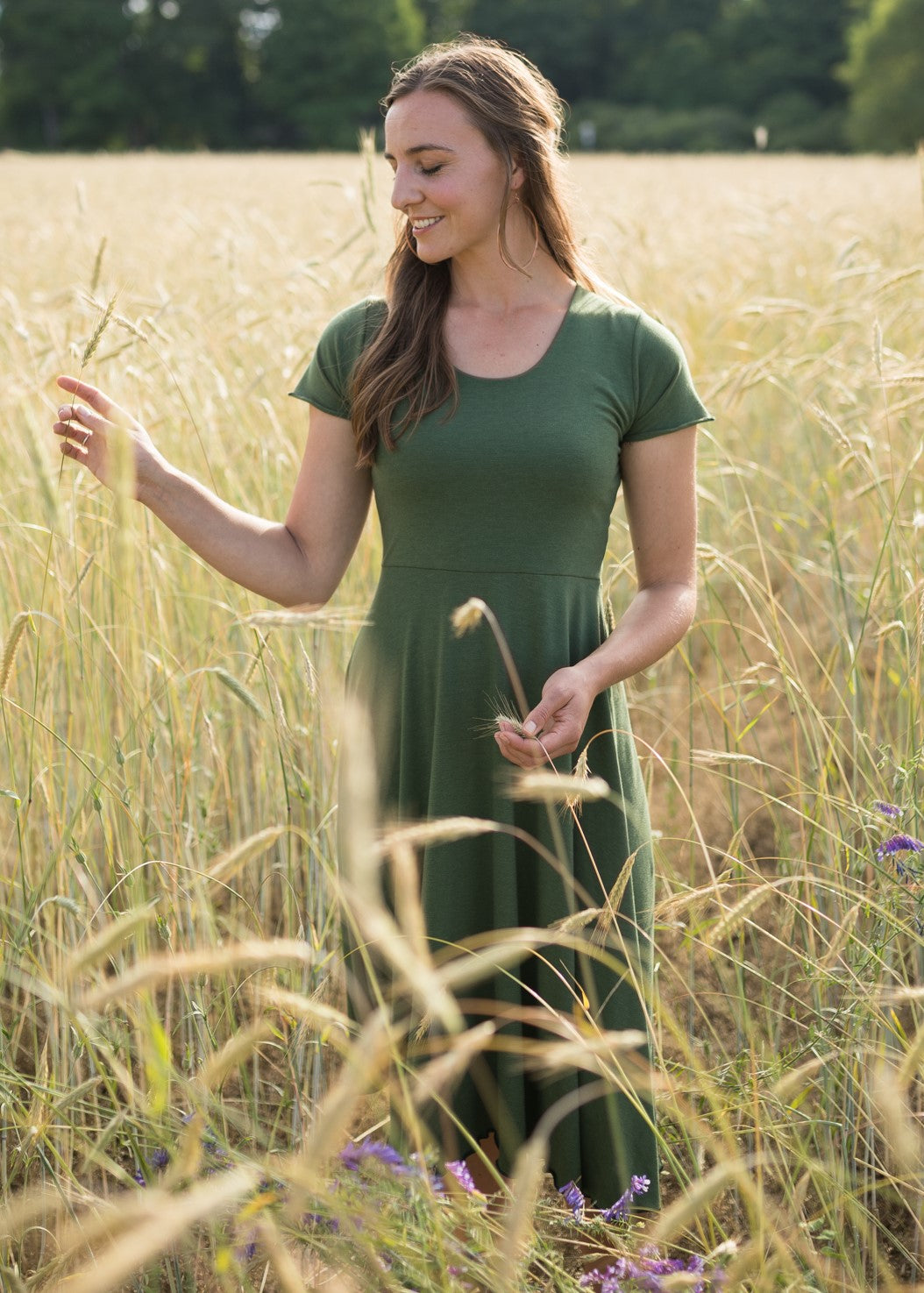 This dress is made from Lyocell & Organic Cotton Jersey fabric. This material is very soft, smooth, stretchy, lightweight, and breathable. It has a beautiful drape and flow, with relatively good coverage for how thin it is. The fiber content is 66% Lyocell, 28% Organic Cotton, and 6% Spandex.