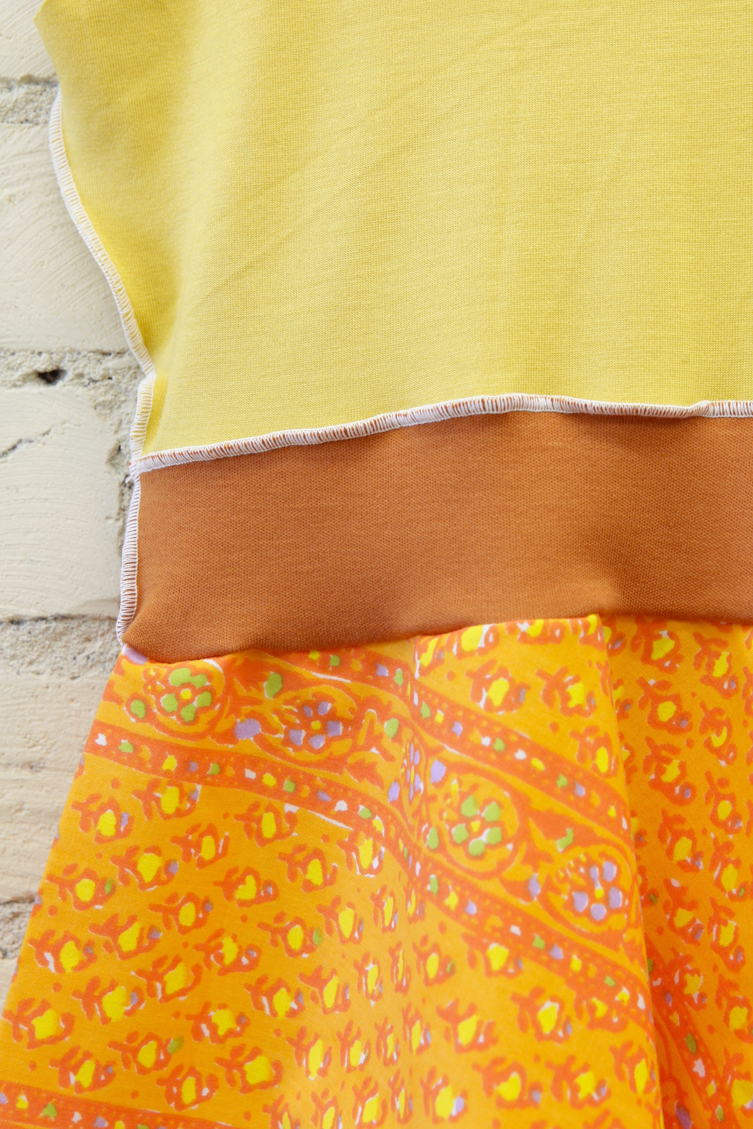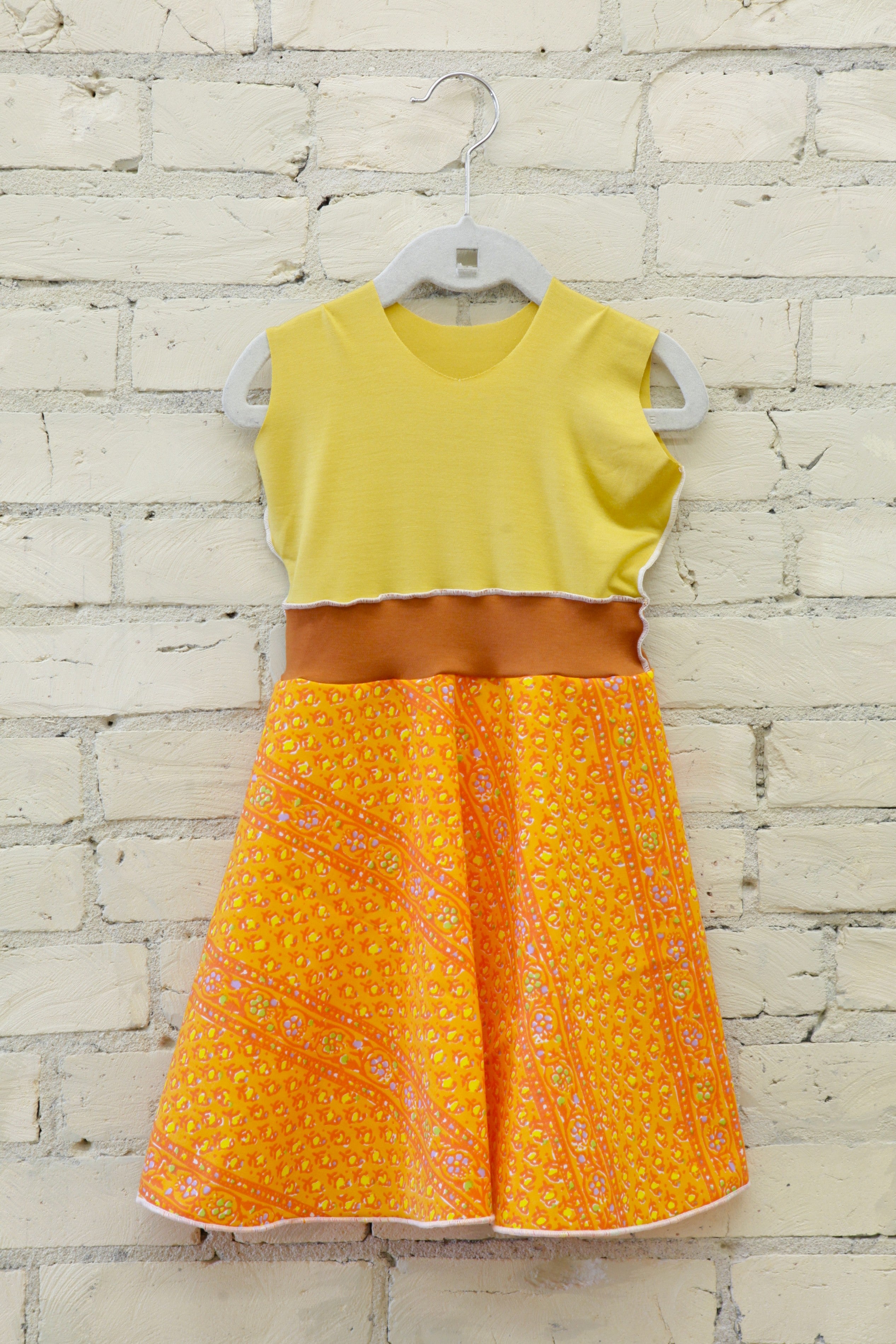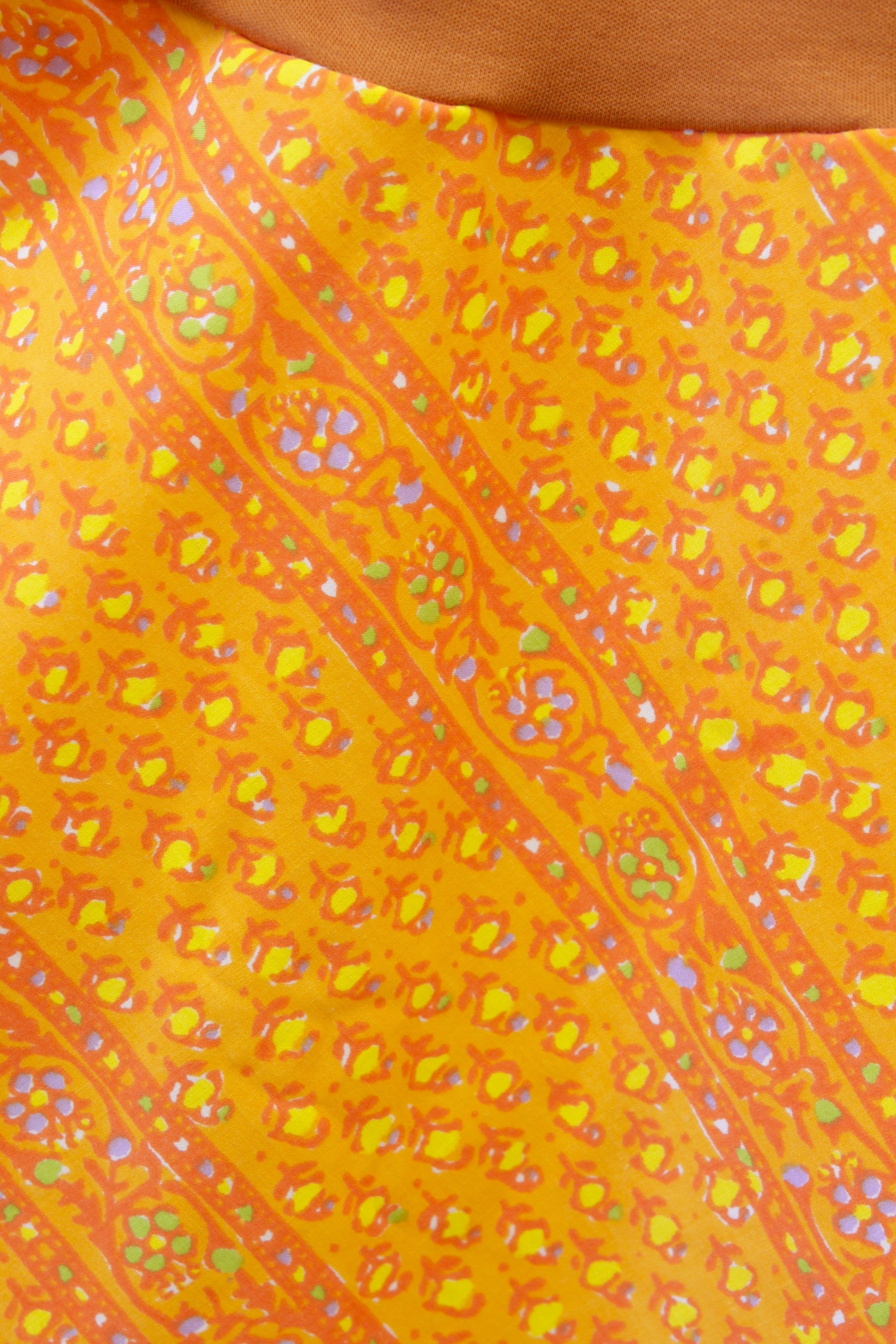 We named this dress “Marigold” because it really reminds us of all the fun and joyful Oranges and Yellows you can find in this fun flower. The vintage feeling floral pattern is a bit abstract; it sure looks like a cute little marigold stem to me!