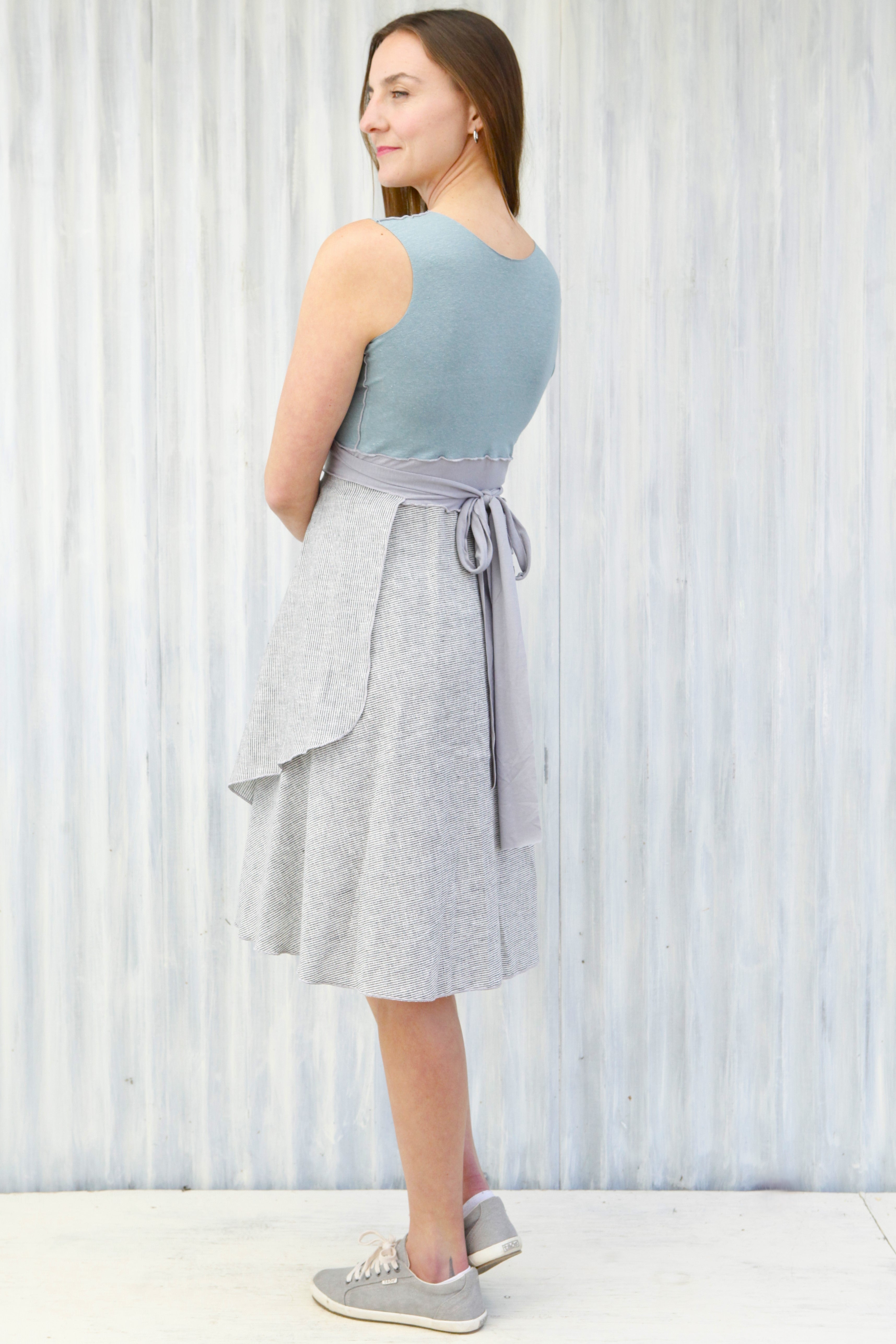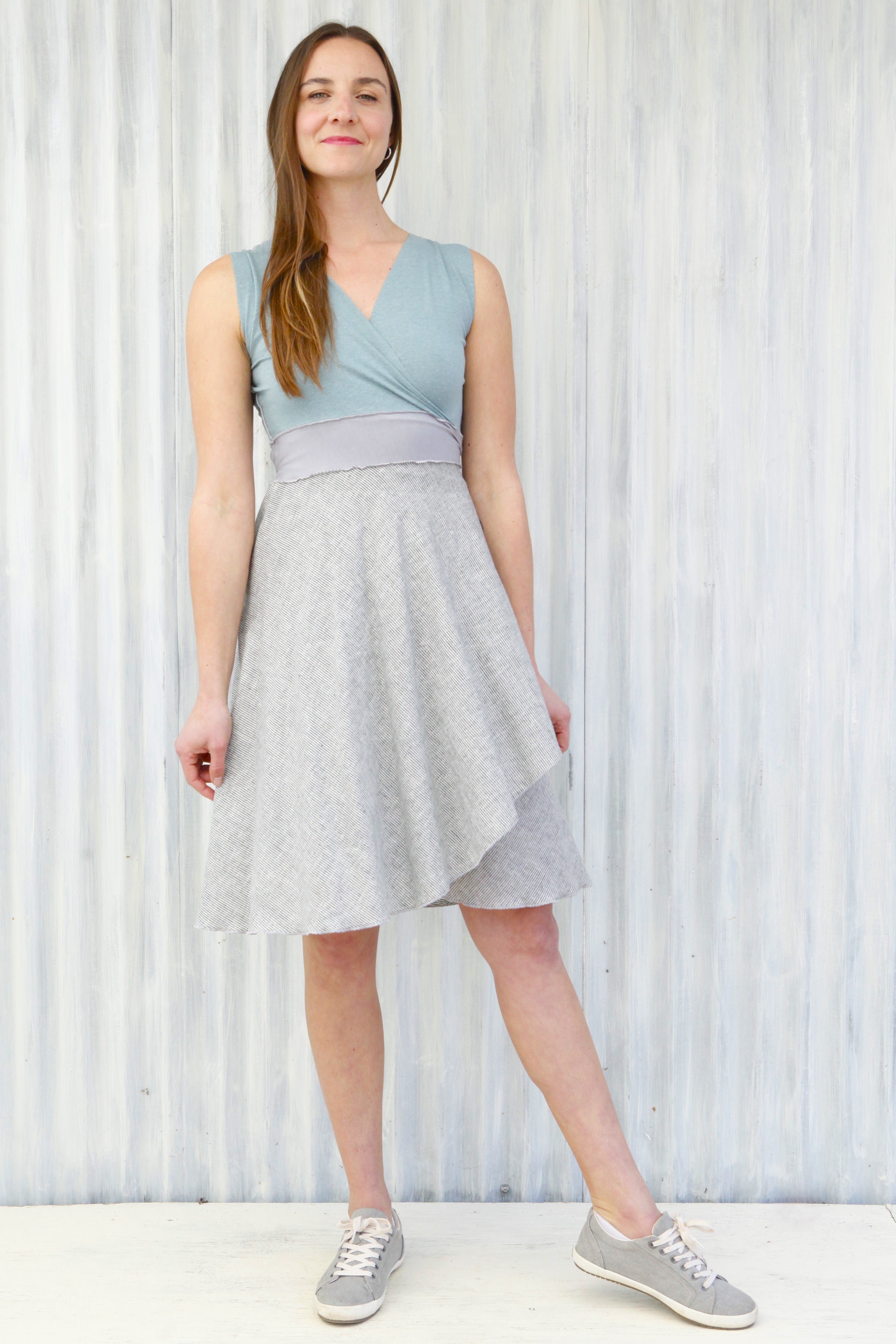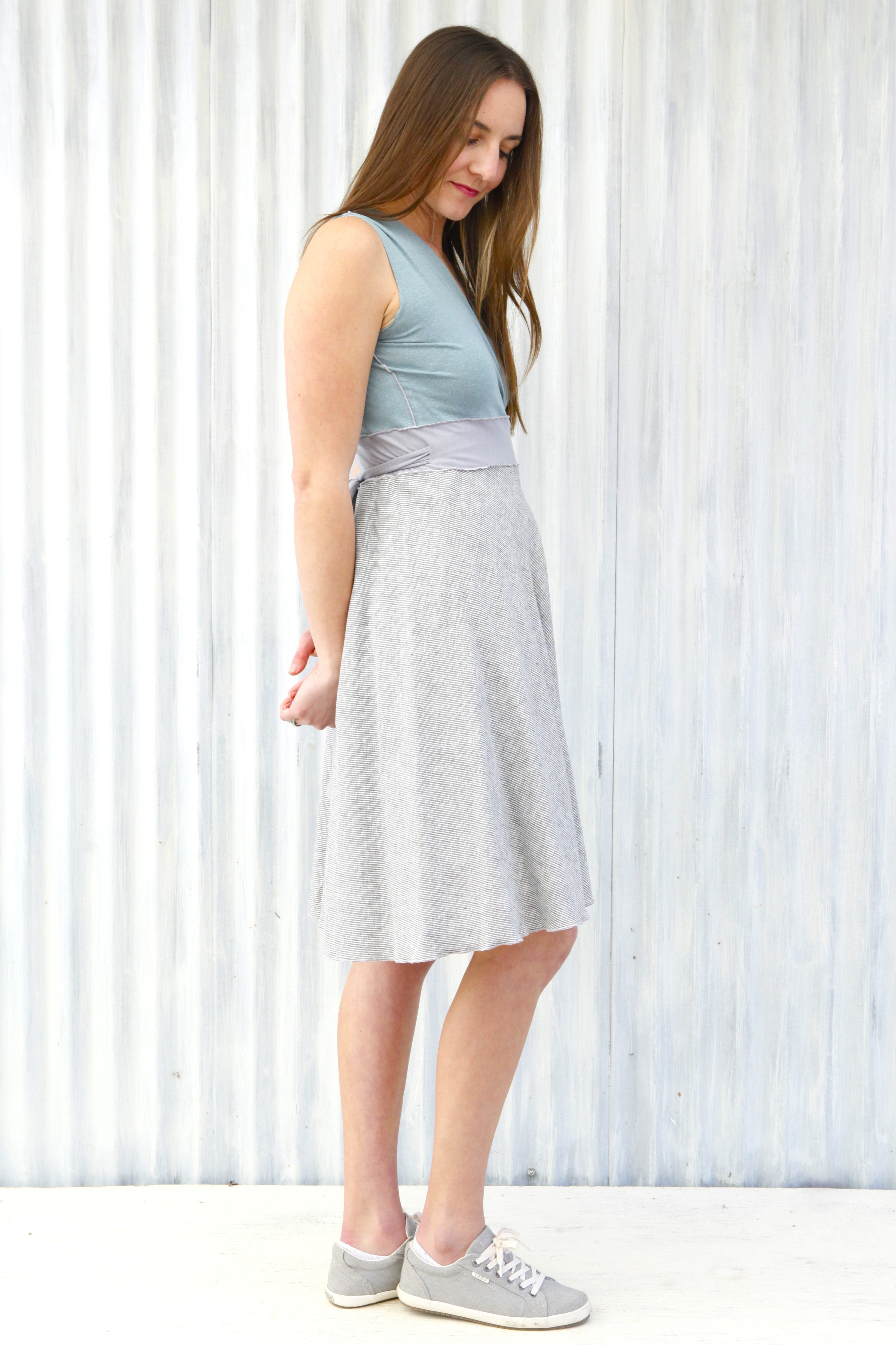 This dress is available and pictured with a Mist (light blue color) top and a Fog (light gray with subtle white stripes) skirt.