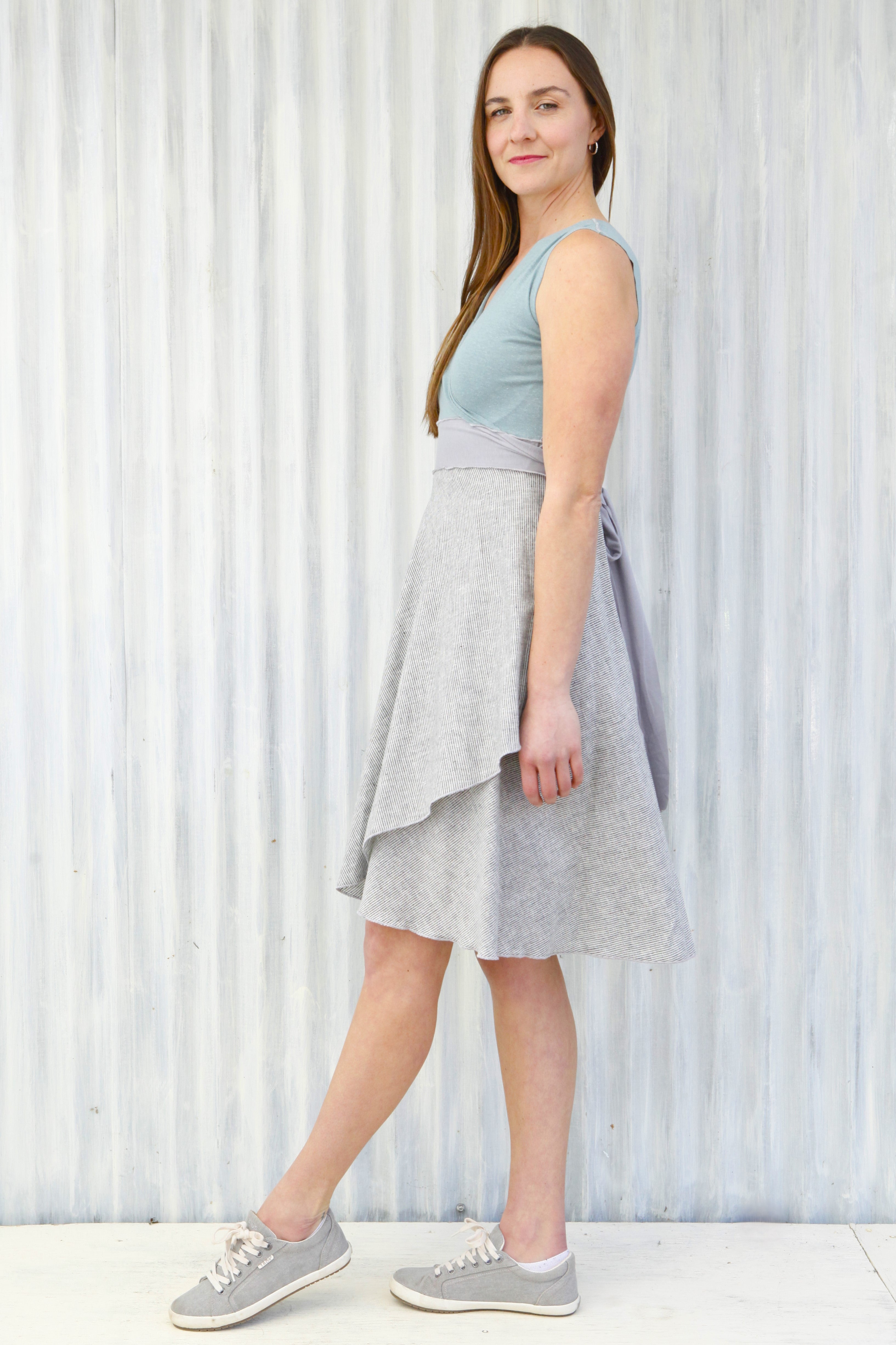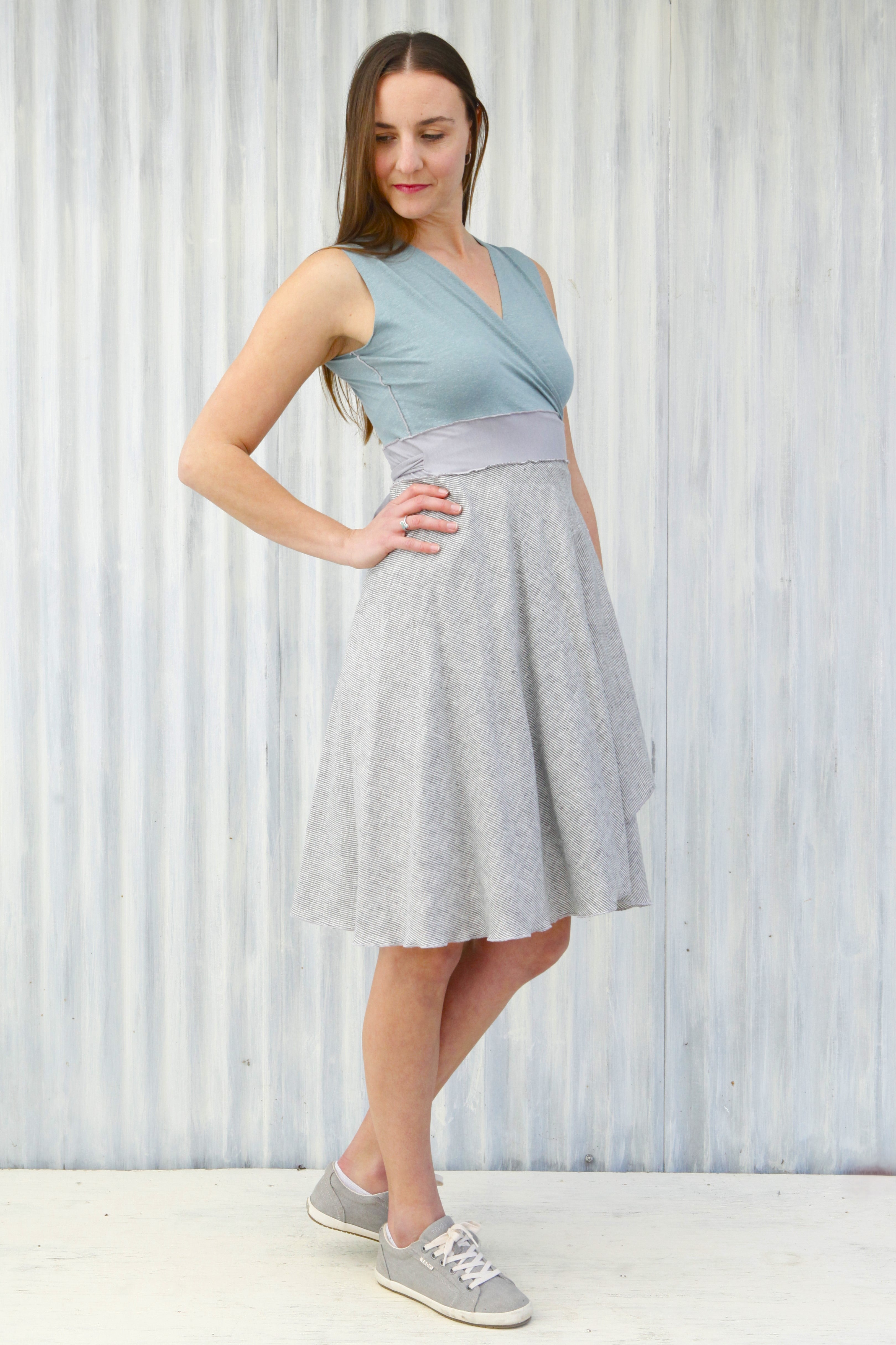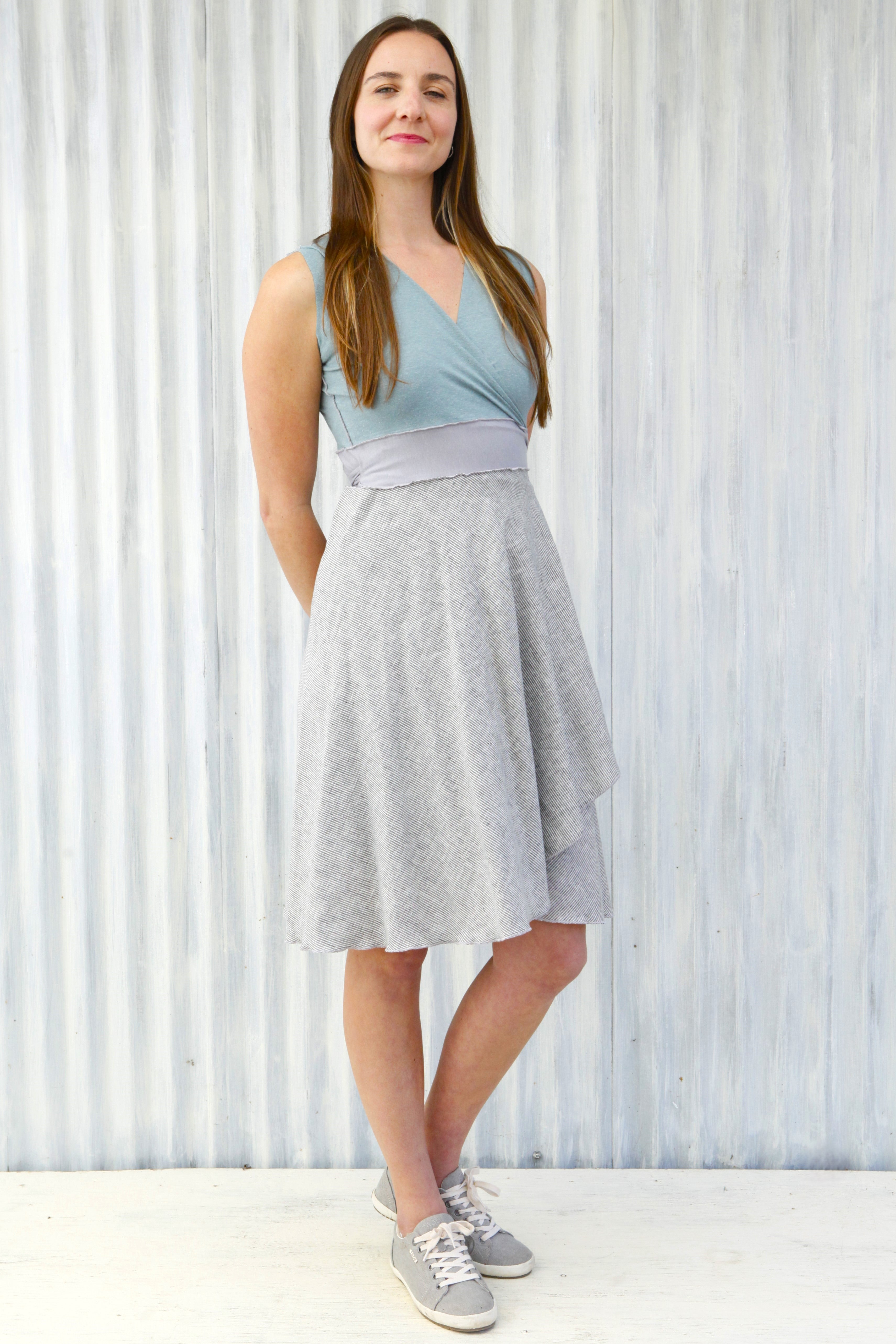 This dress is available and pictured with a Mist (light blue color) top and a Fog (light gray with subtle white stripes) skirt.
