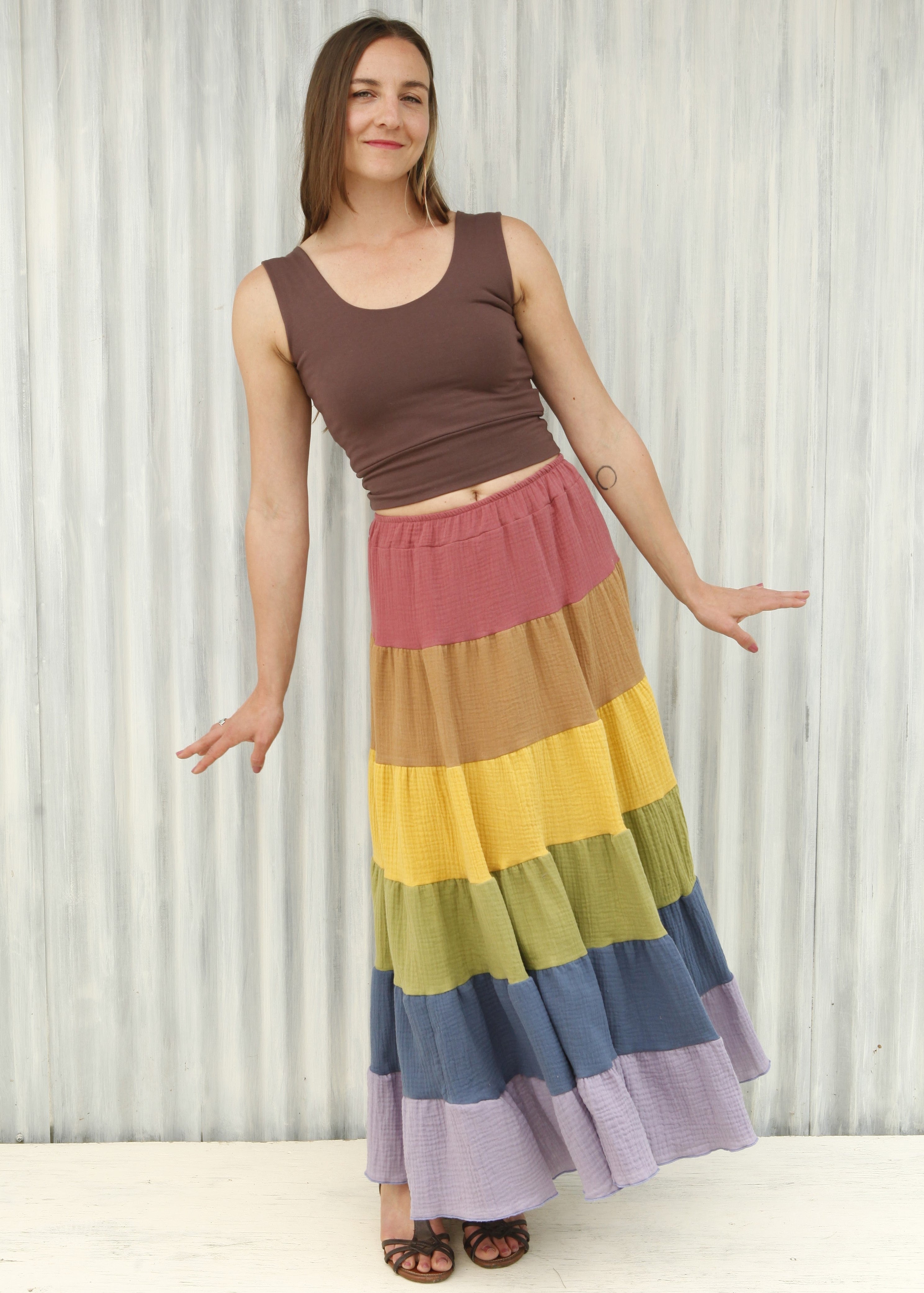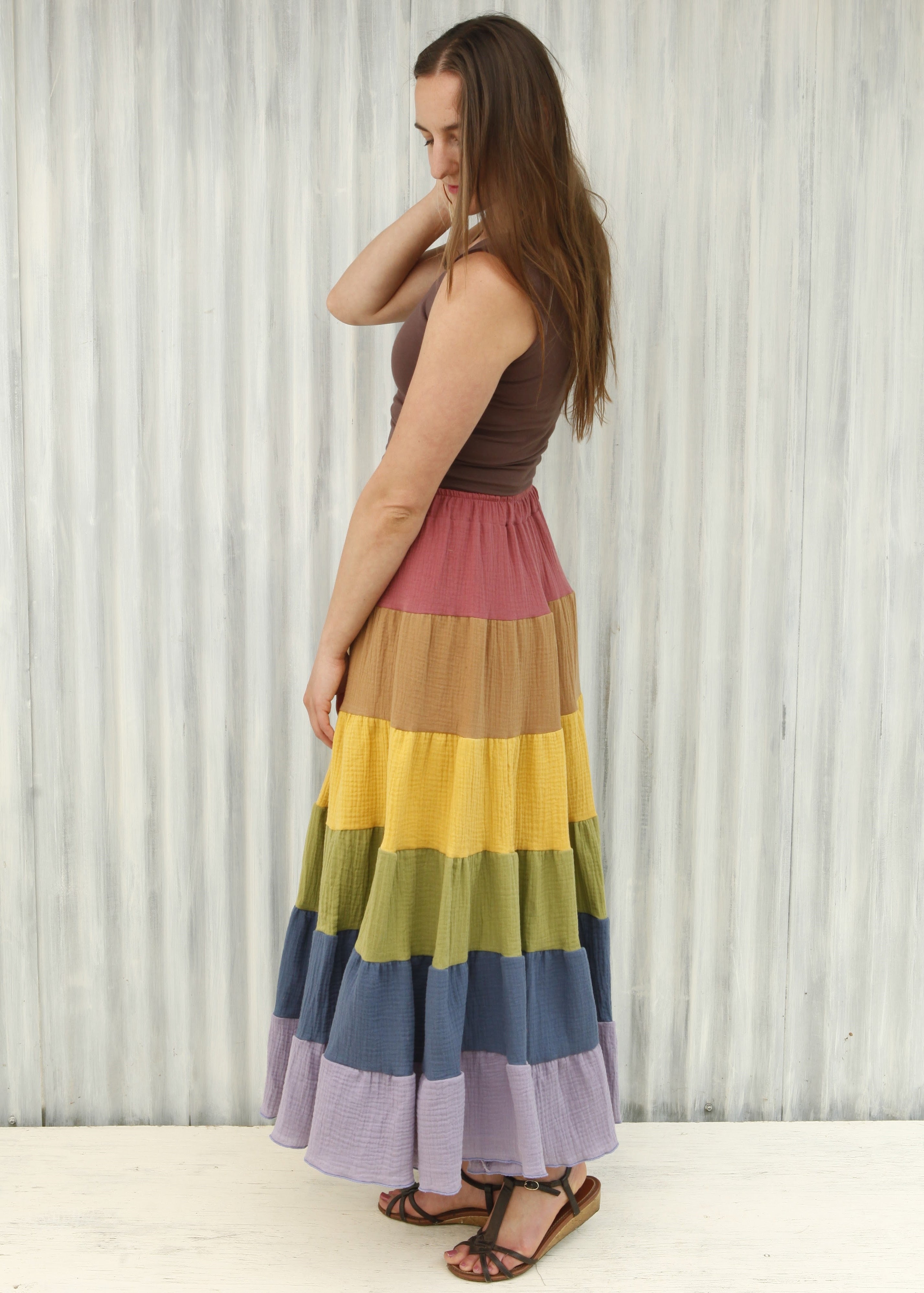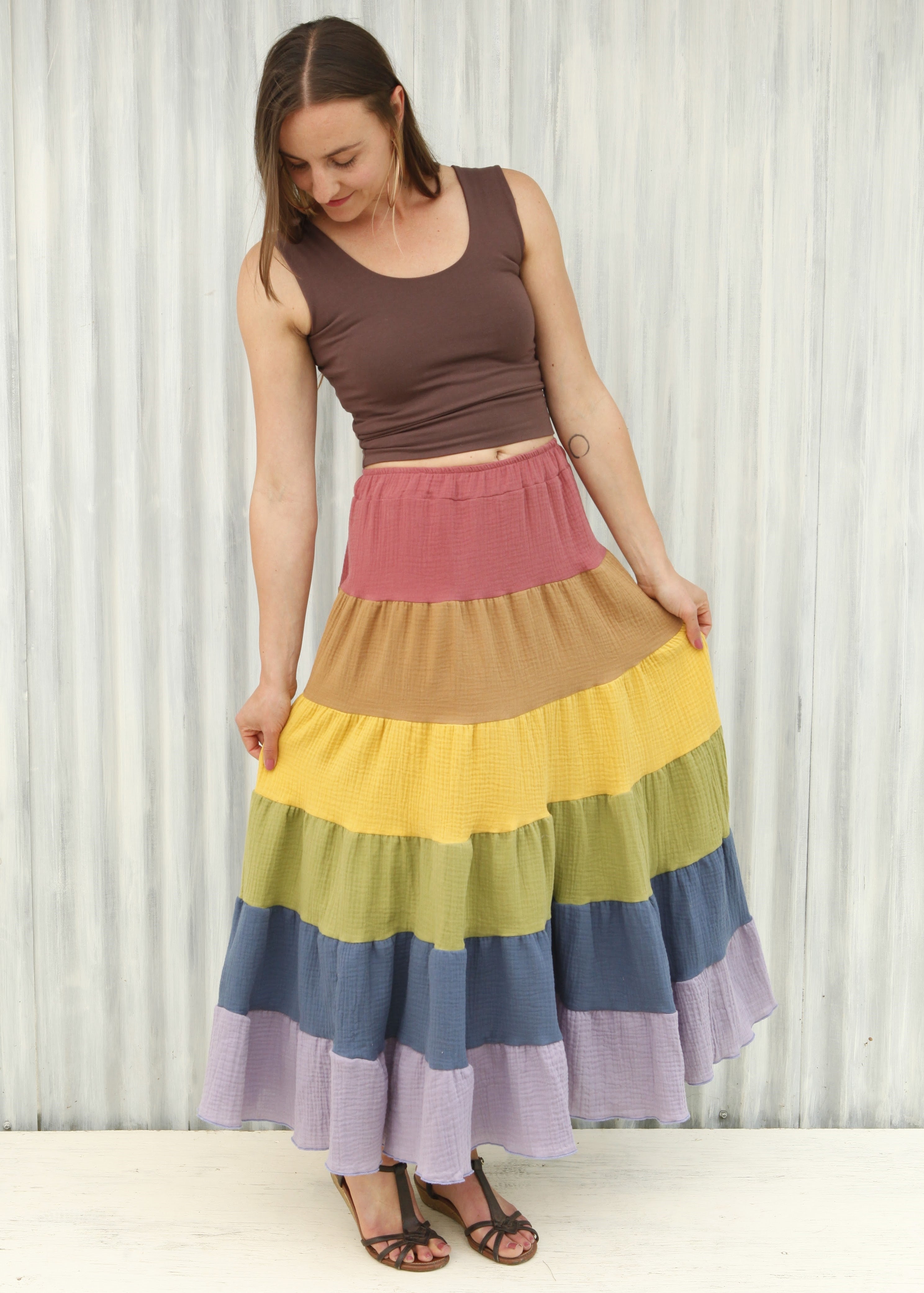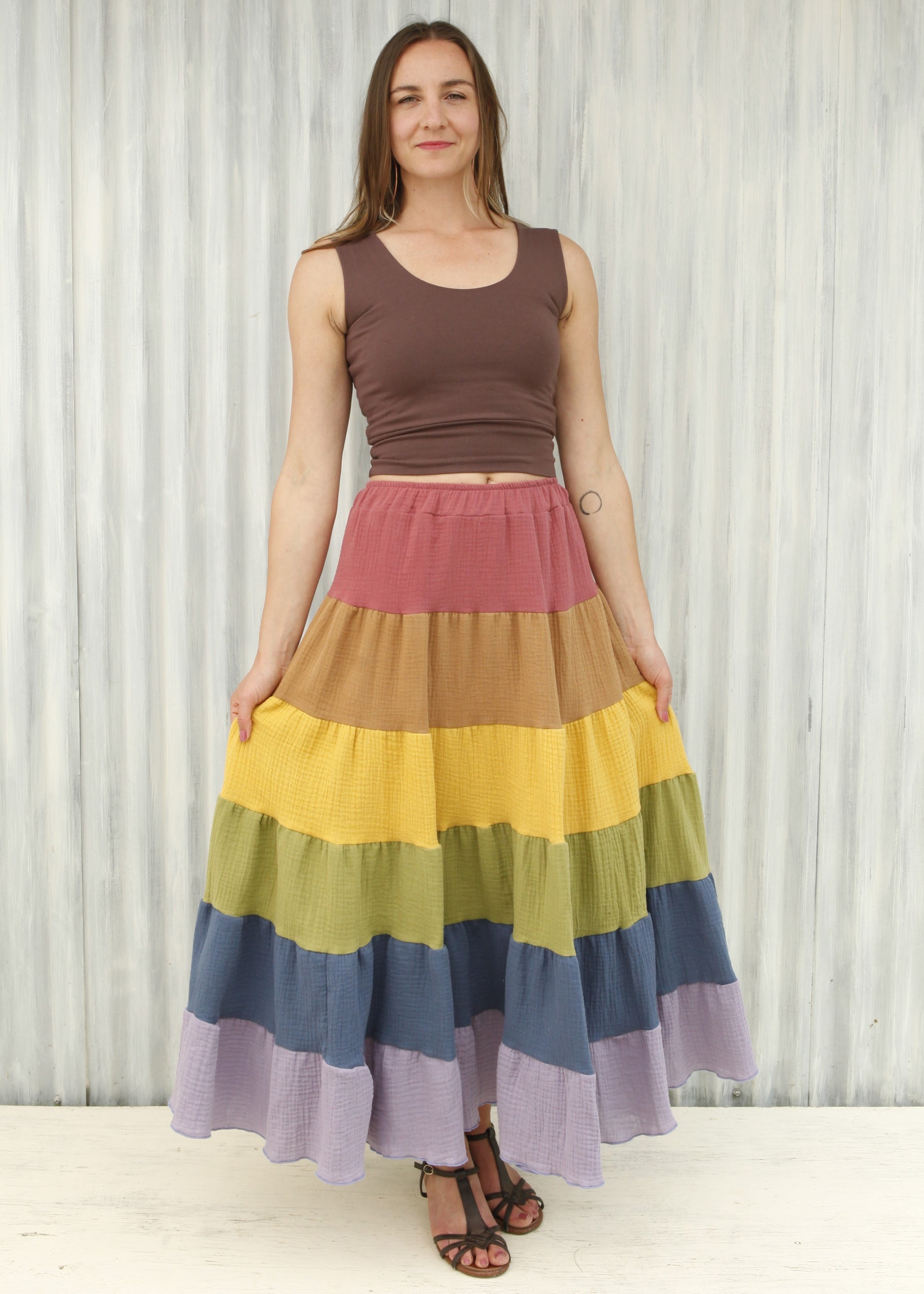 This skirt is a full pastel rainbow, from Rose, to Rust, through Yellow, Green, Blue, and Lavender.