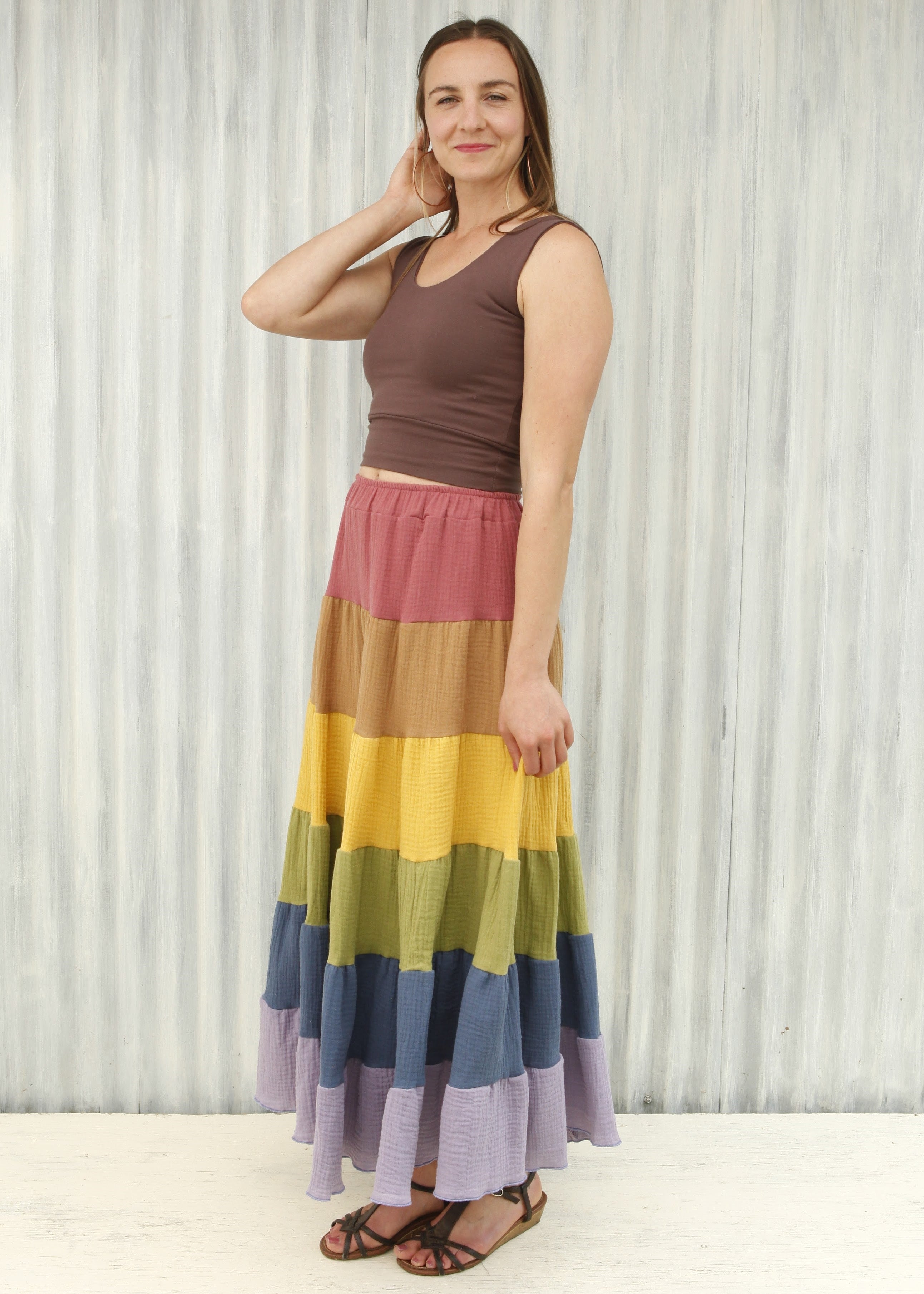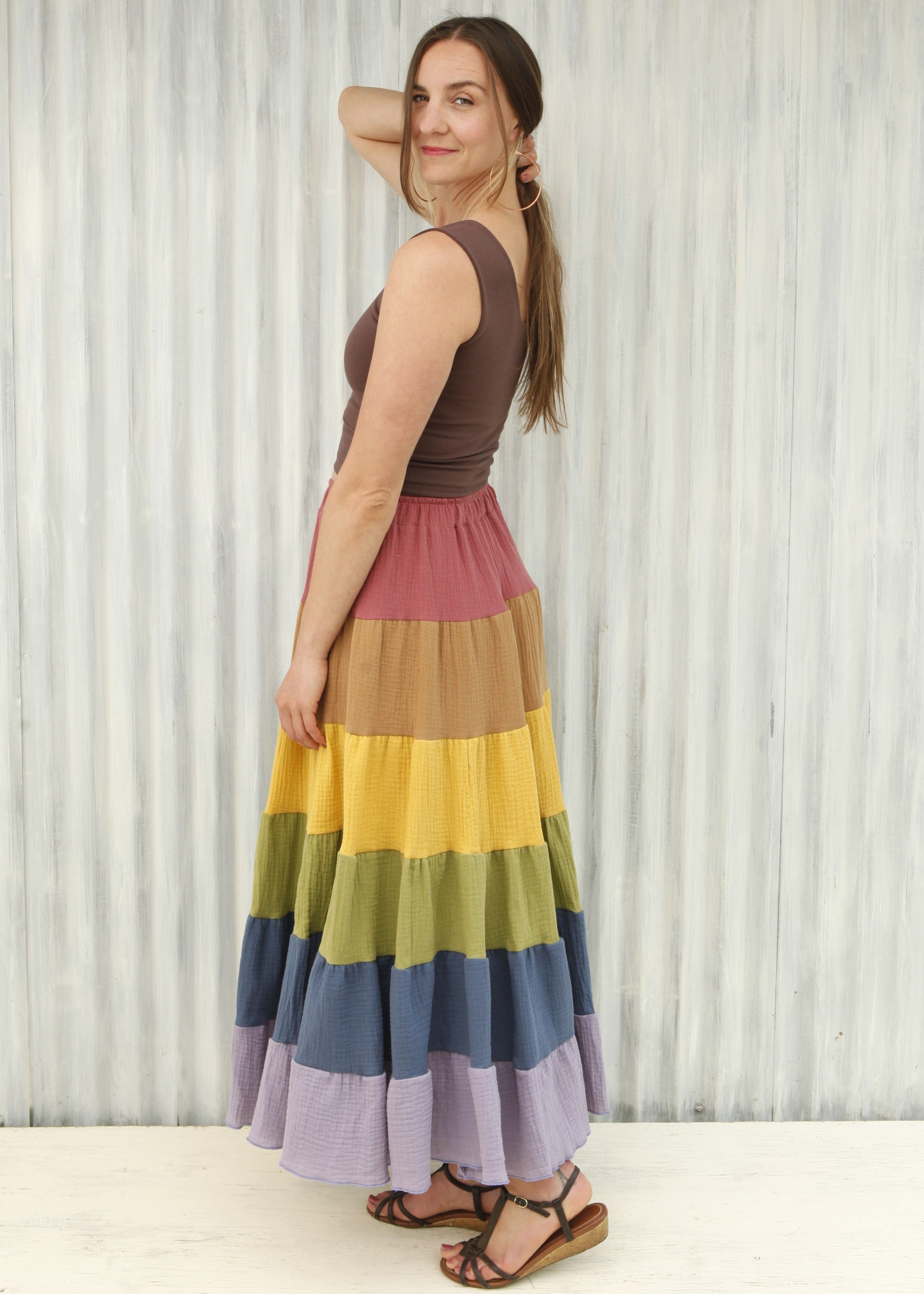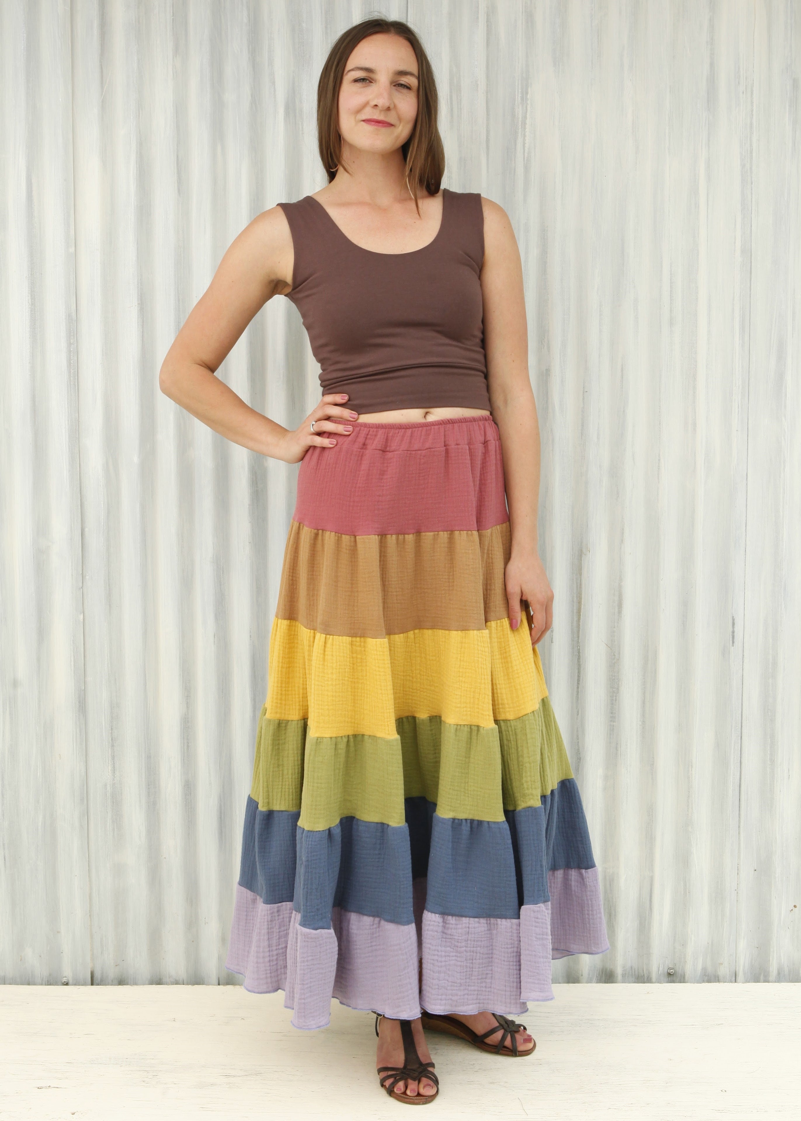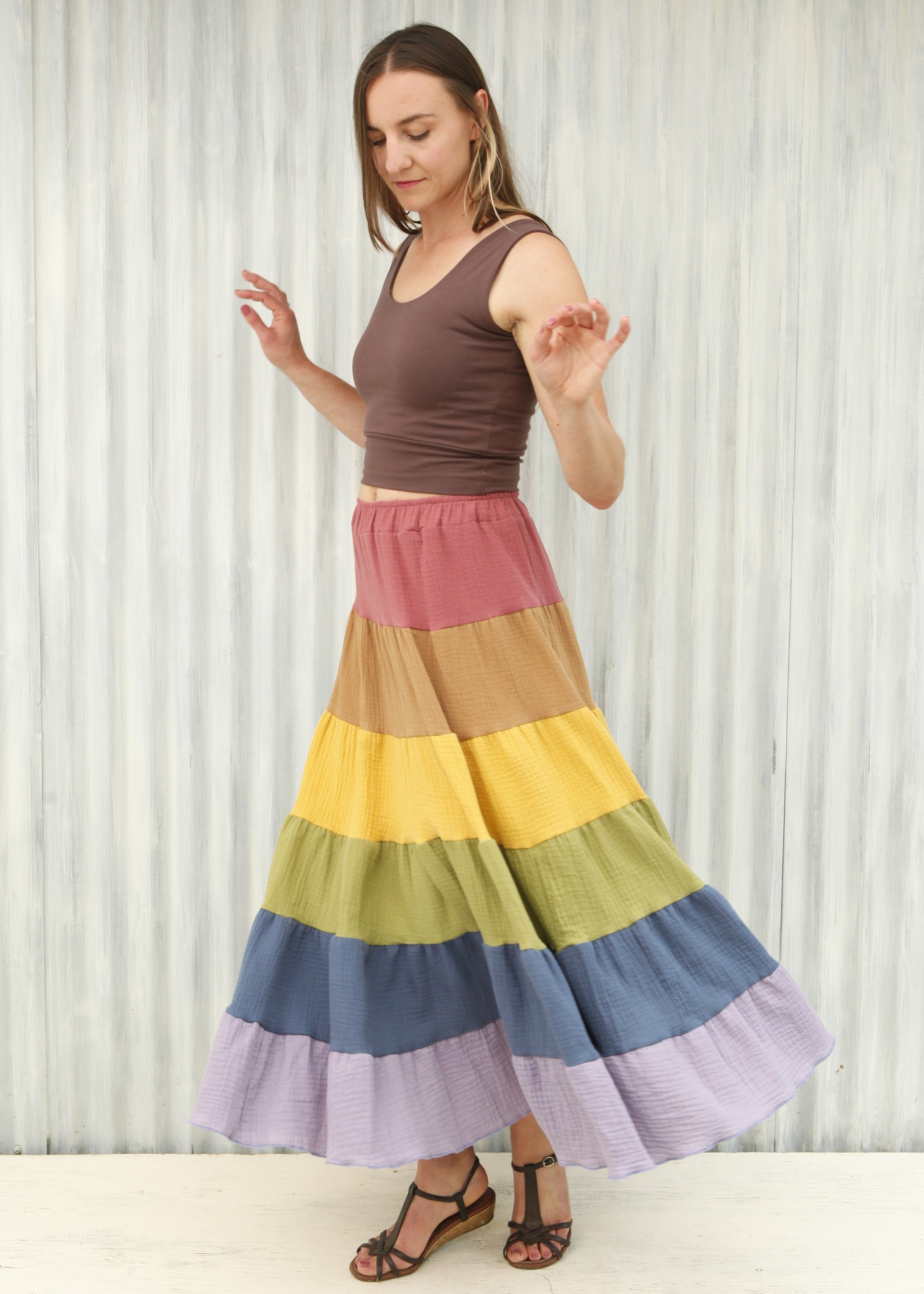 This skirt is a full pastel rainbow, from Rose, to Rust, through Yellow, Green, Blue, and Lavender.