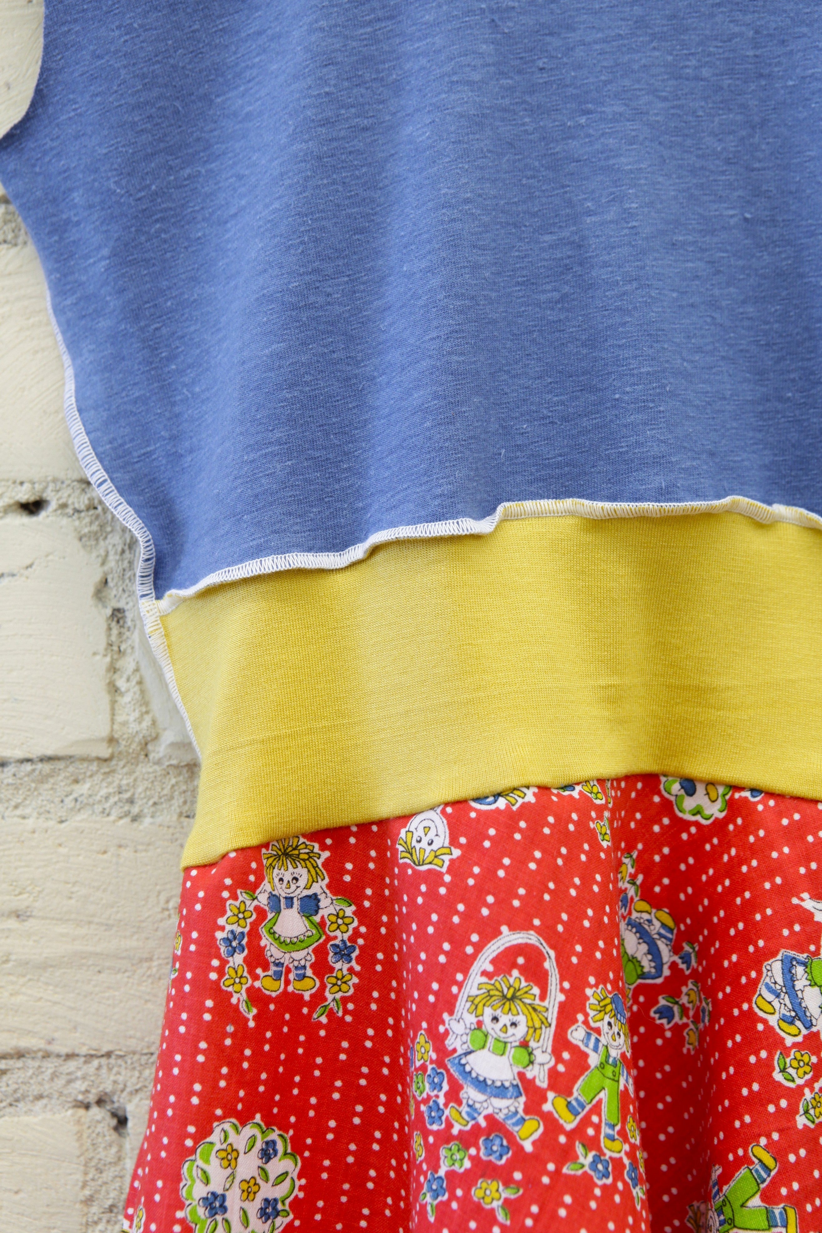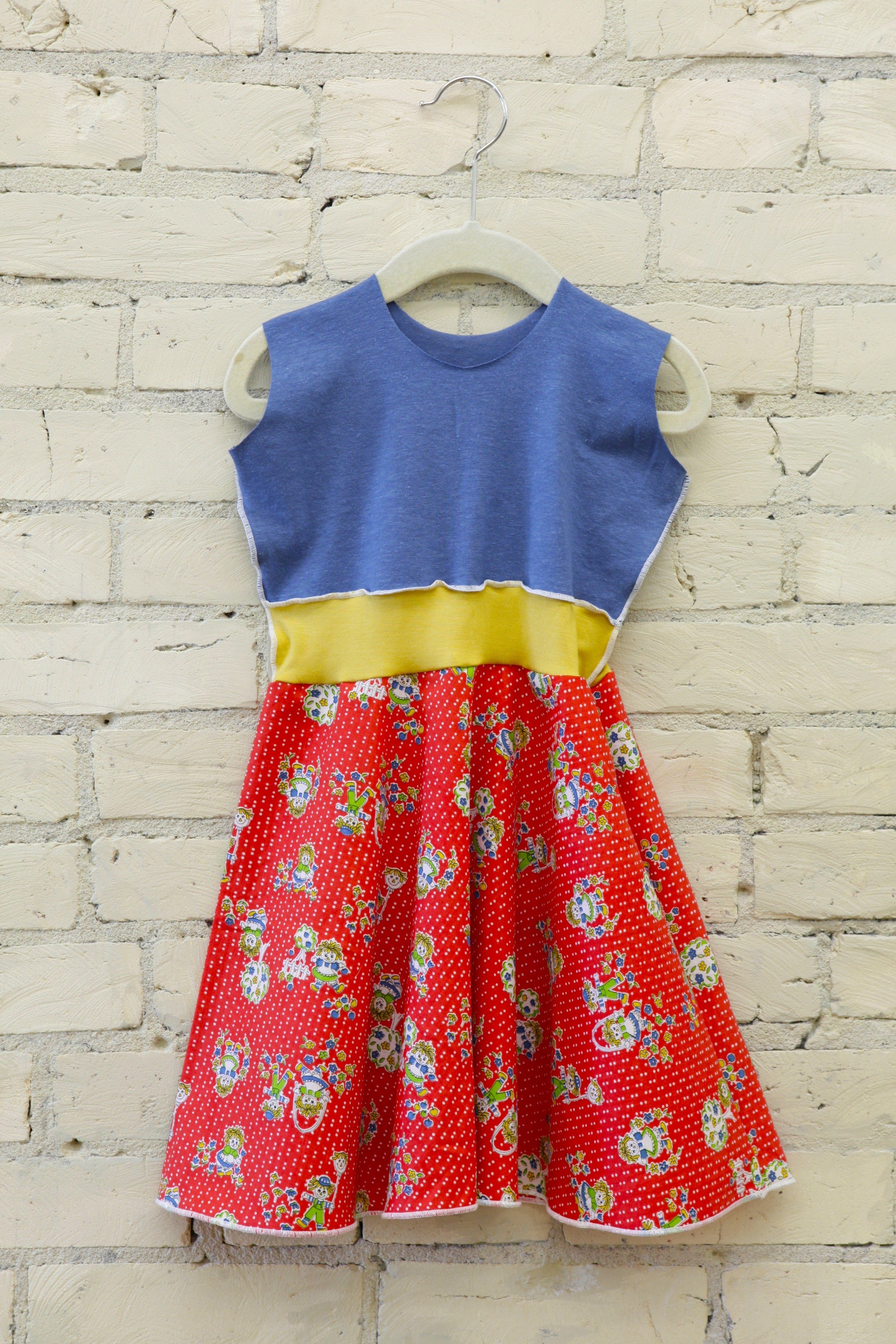 This dress has a Red Retro Rag Doll Print skirt, Celeste Blue top, and Yellow band.