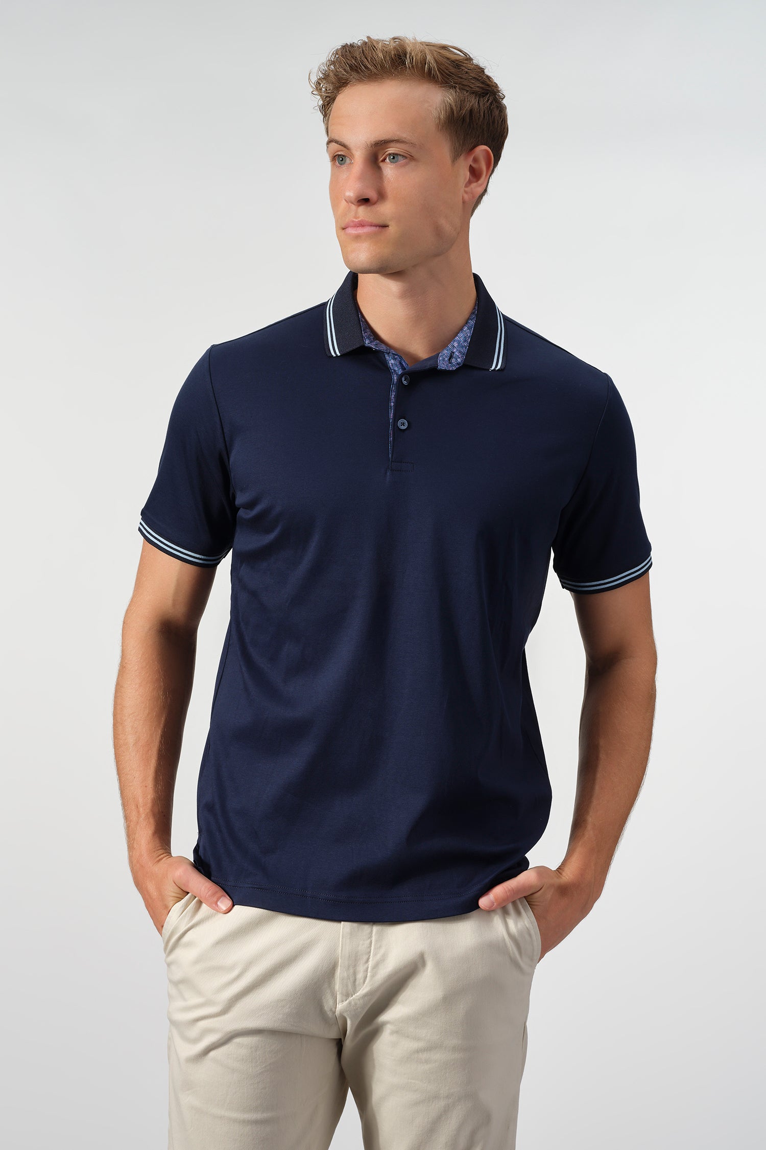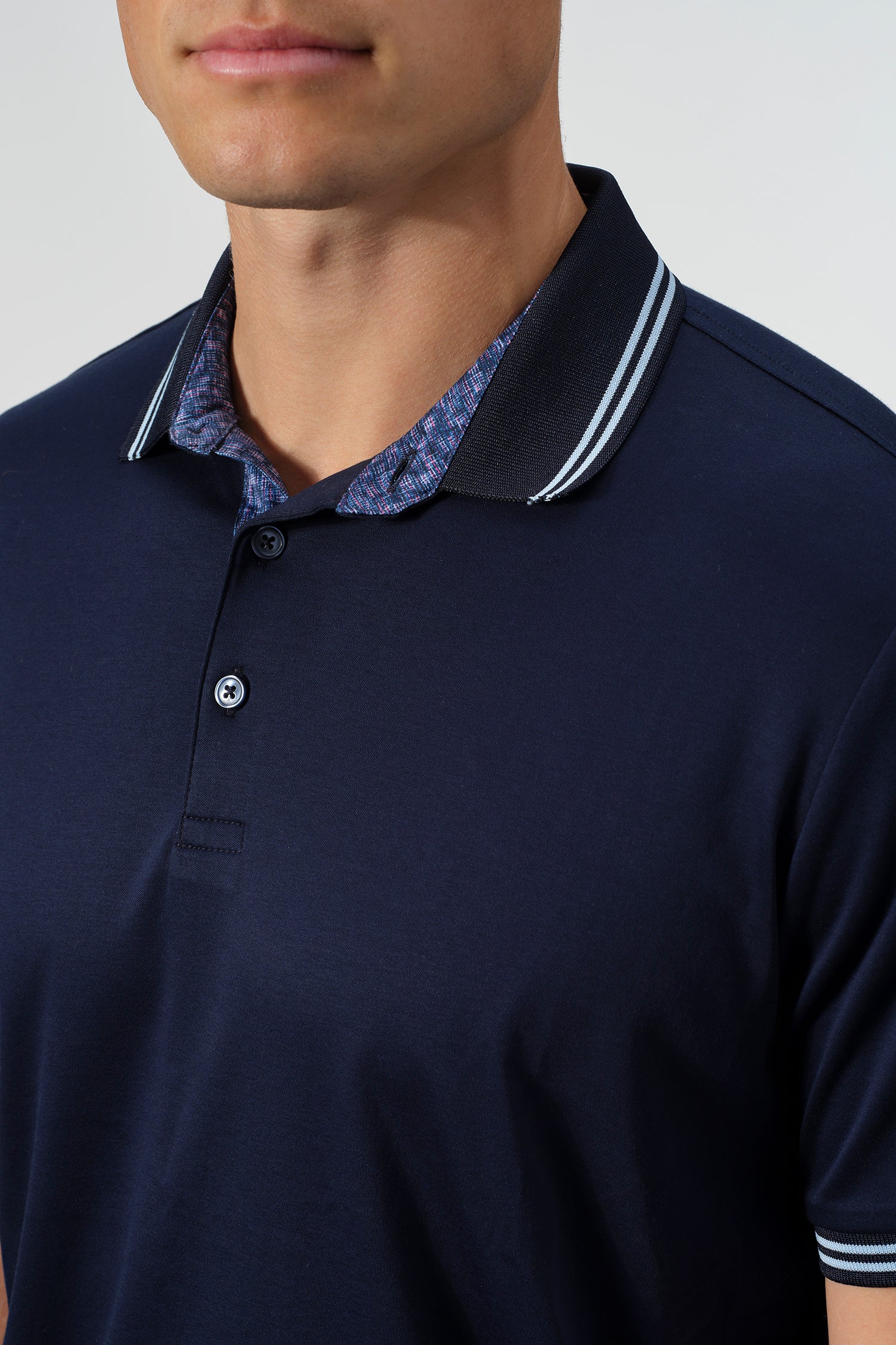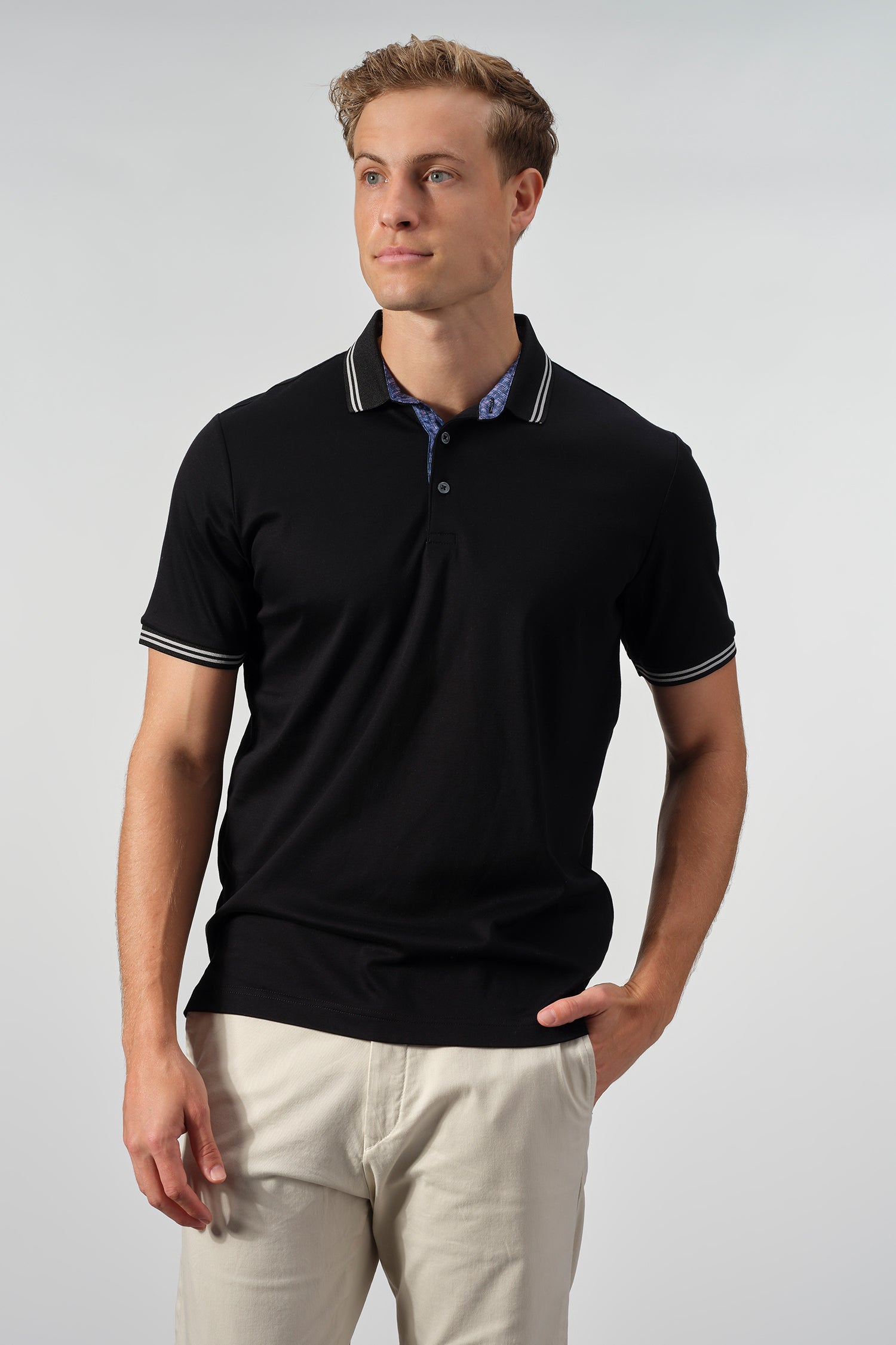 Subtle contrast details elevate the design, from the striped collar and sleeve cuffs to the patterned inner placket that adds a discreet touch of visual interest. Finished with a clean silhouette and an American-tailored fit, this polo transitions seamlessly from casual work settings to relaxed off-duty wear.