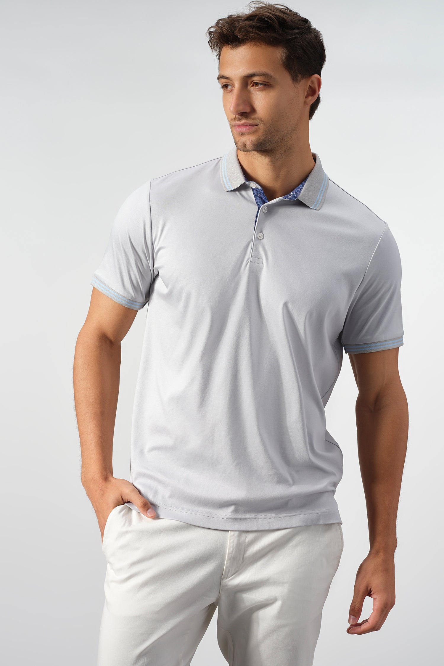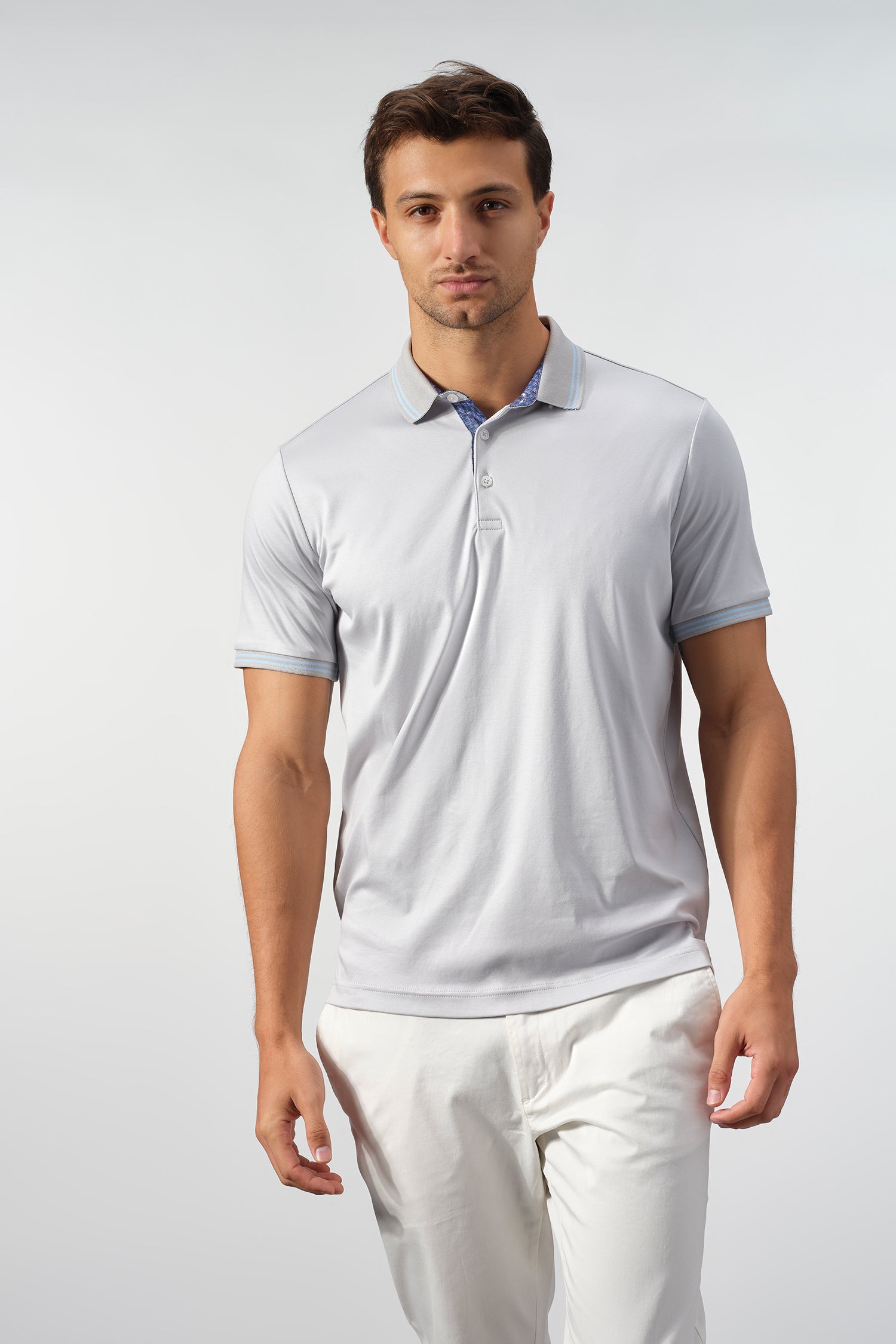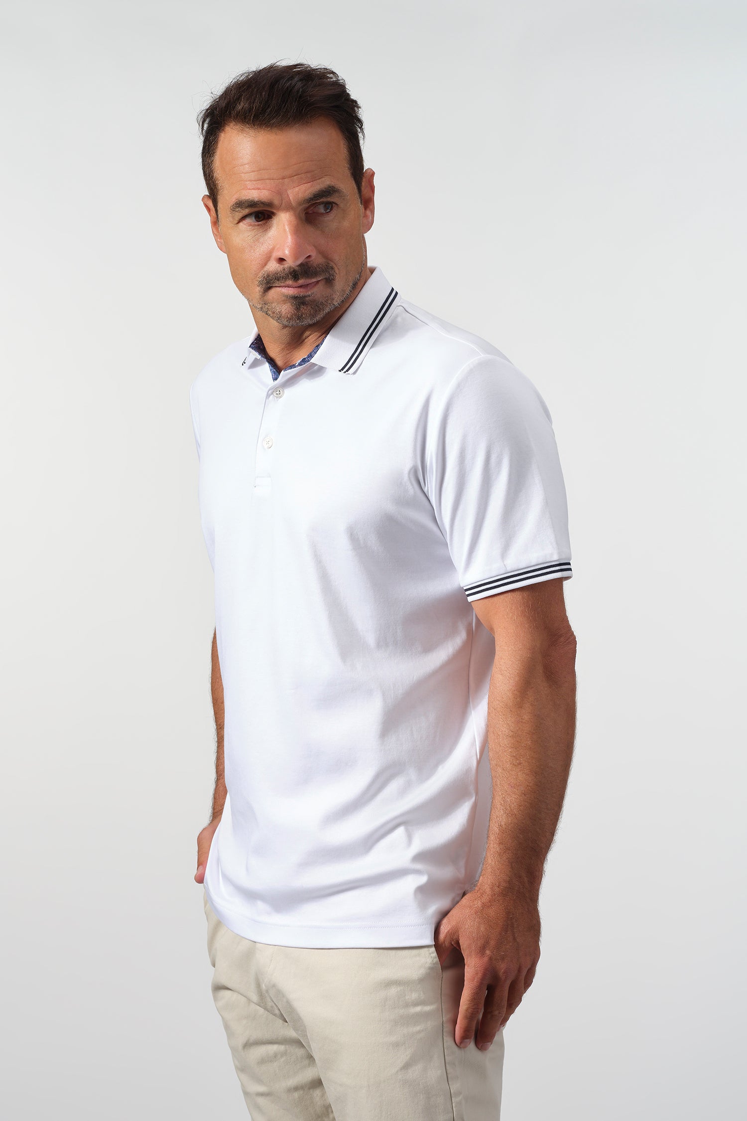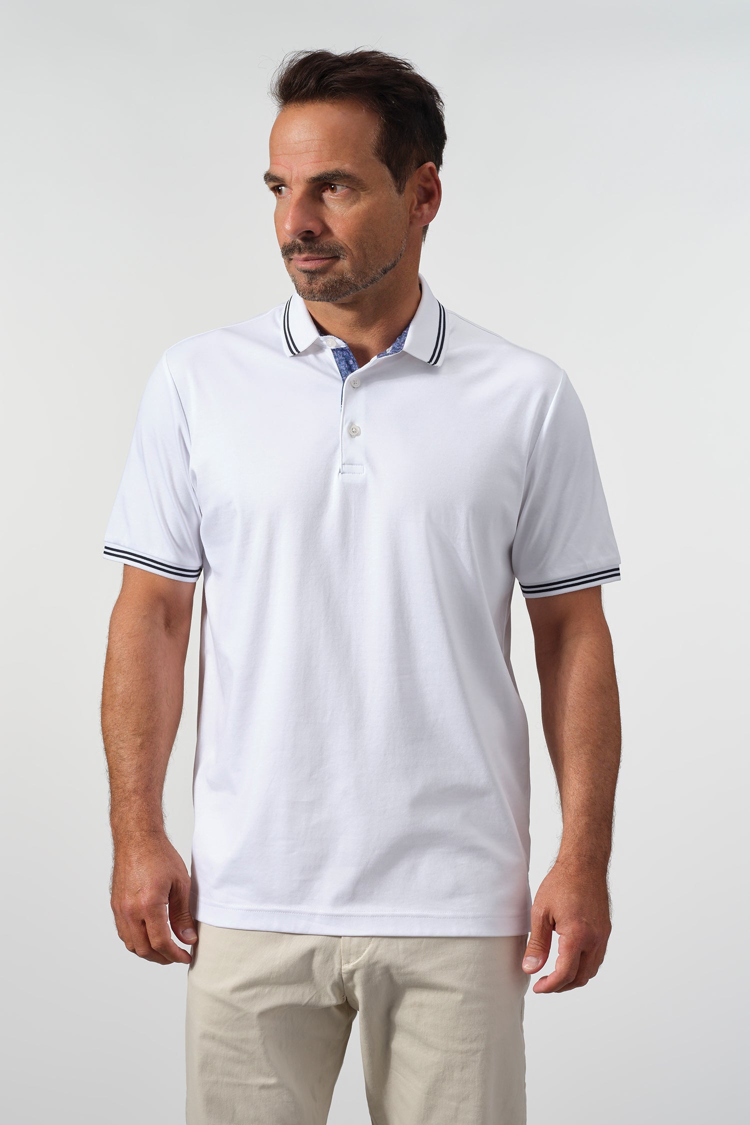 Subtle contrast details elevate the design, from the striped collar and sleeve cuffs to the patterned inner placket that adds a discreet touch of visual interest. Finished with a clean silhouette and an American-tailored fit, this polo transitions seamlessly from casual work settings to relaxed off-duty wear.