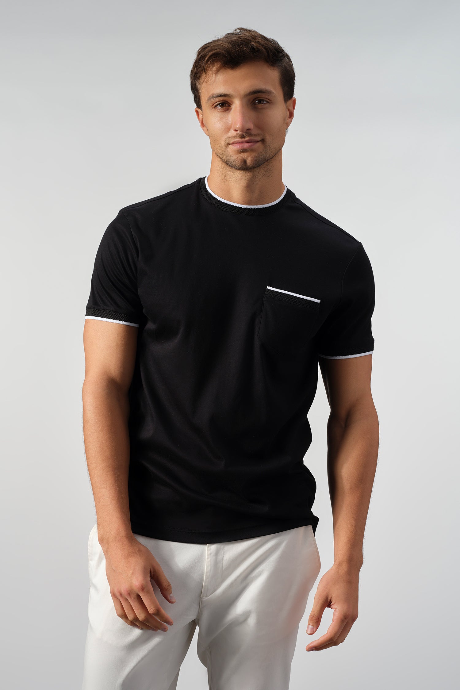 Thoughtful contrast details add a subtle point of distinction, including refined trim at the collar, sleeves, and chest pocket for a sleek, modern look. Finished with a clean silhouette and an American-tailored fit, this tee transitions effortlessly from casual daytime wear to elevated off-duty styling.