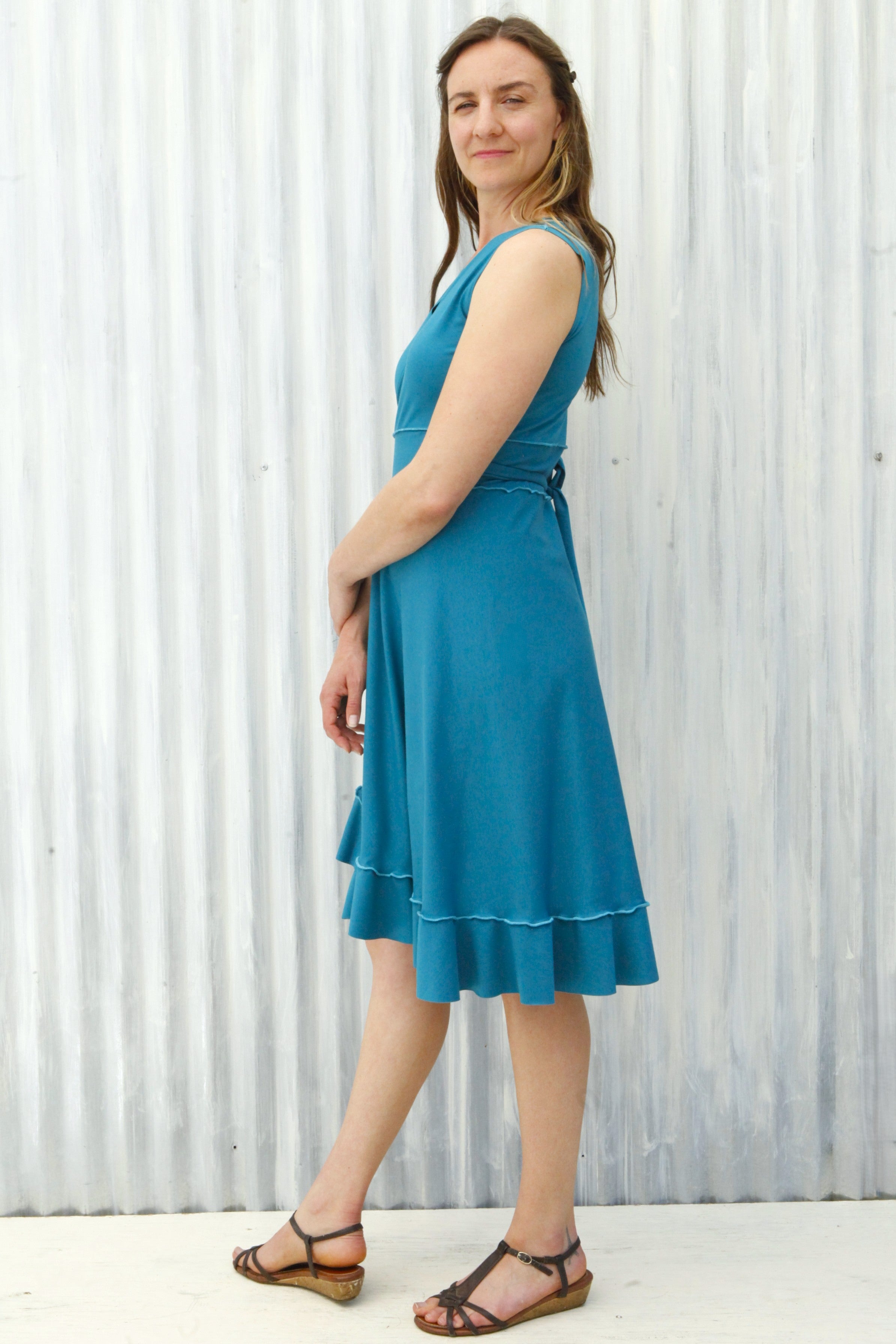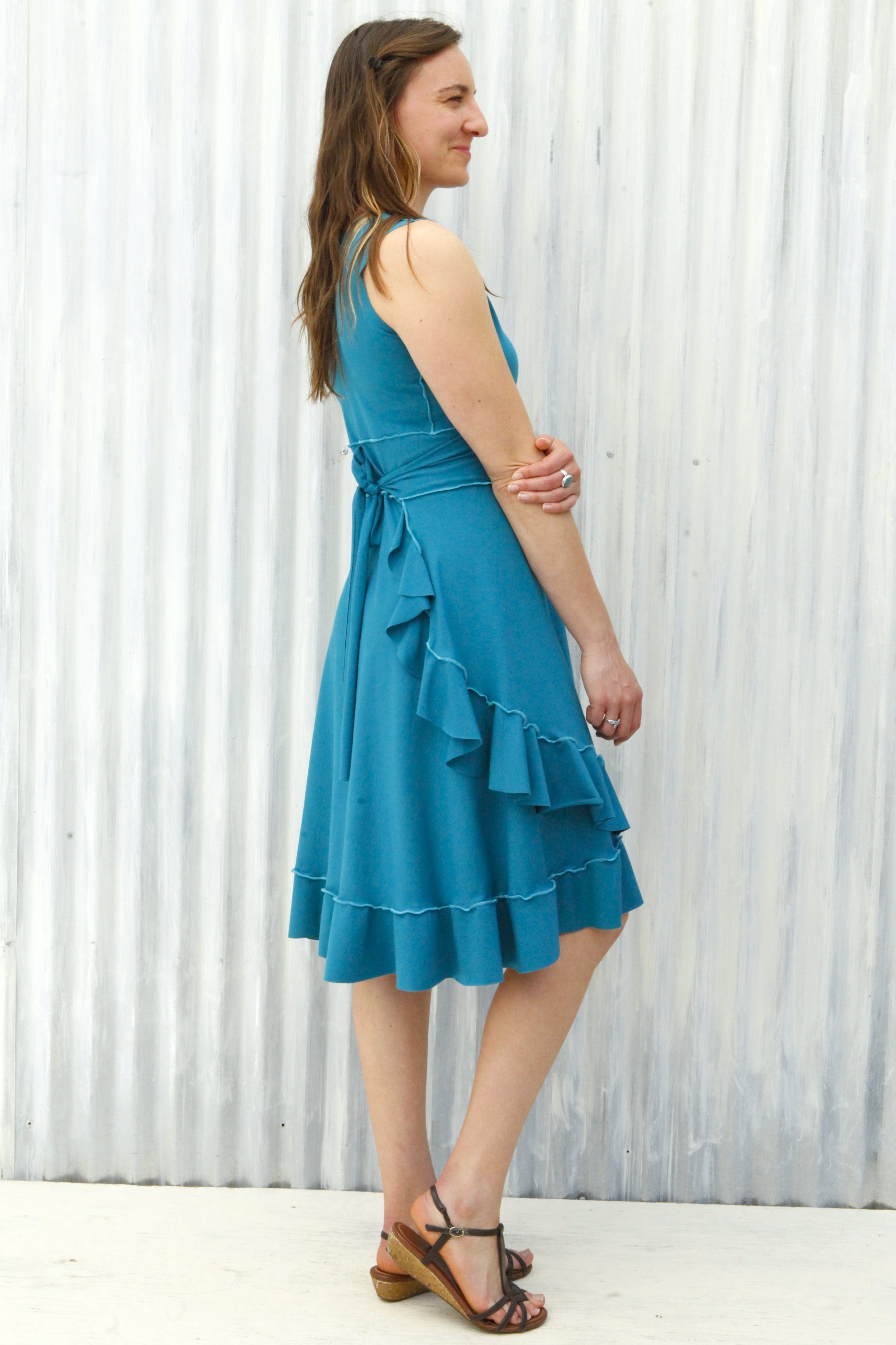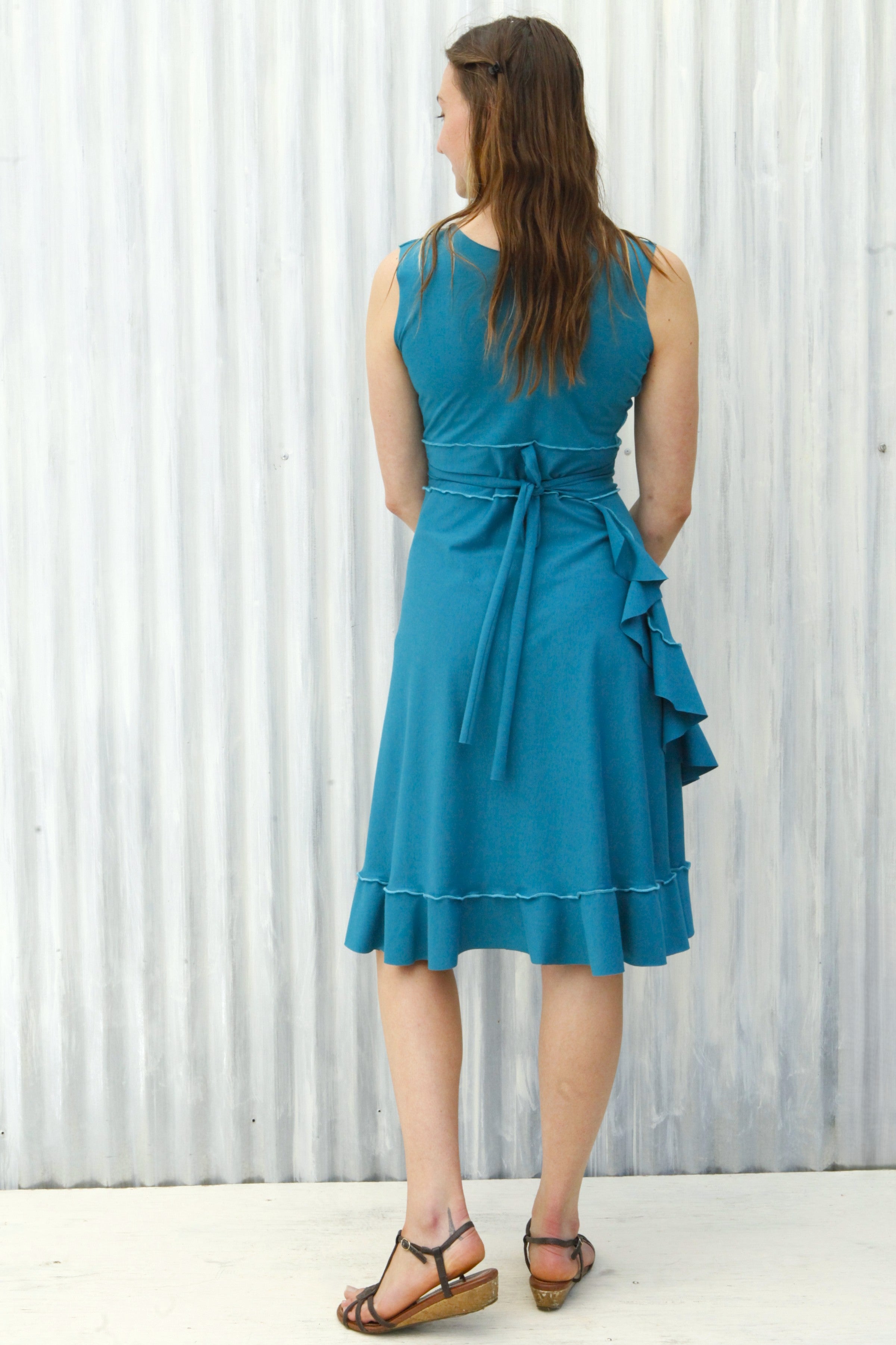 This cute summer dress is so soft and comfortable, it will quickly become your go-to dress for looking great with minimum effort. Perfect for everyday work, play, travel, and stays, it also dresses up quite nicely for fun summer events (especially dance parties!). A longtime favorite Yana Dee design, this style easily fits a wide range of sizes and proportions. With a cute feminine flare, this adjustable ruffled wrap dress is pretty magical in how it can flatter curves without adding too much bulk, or give an hourglass appearance to straighter framed bodies.
