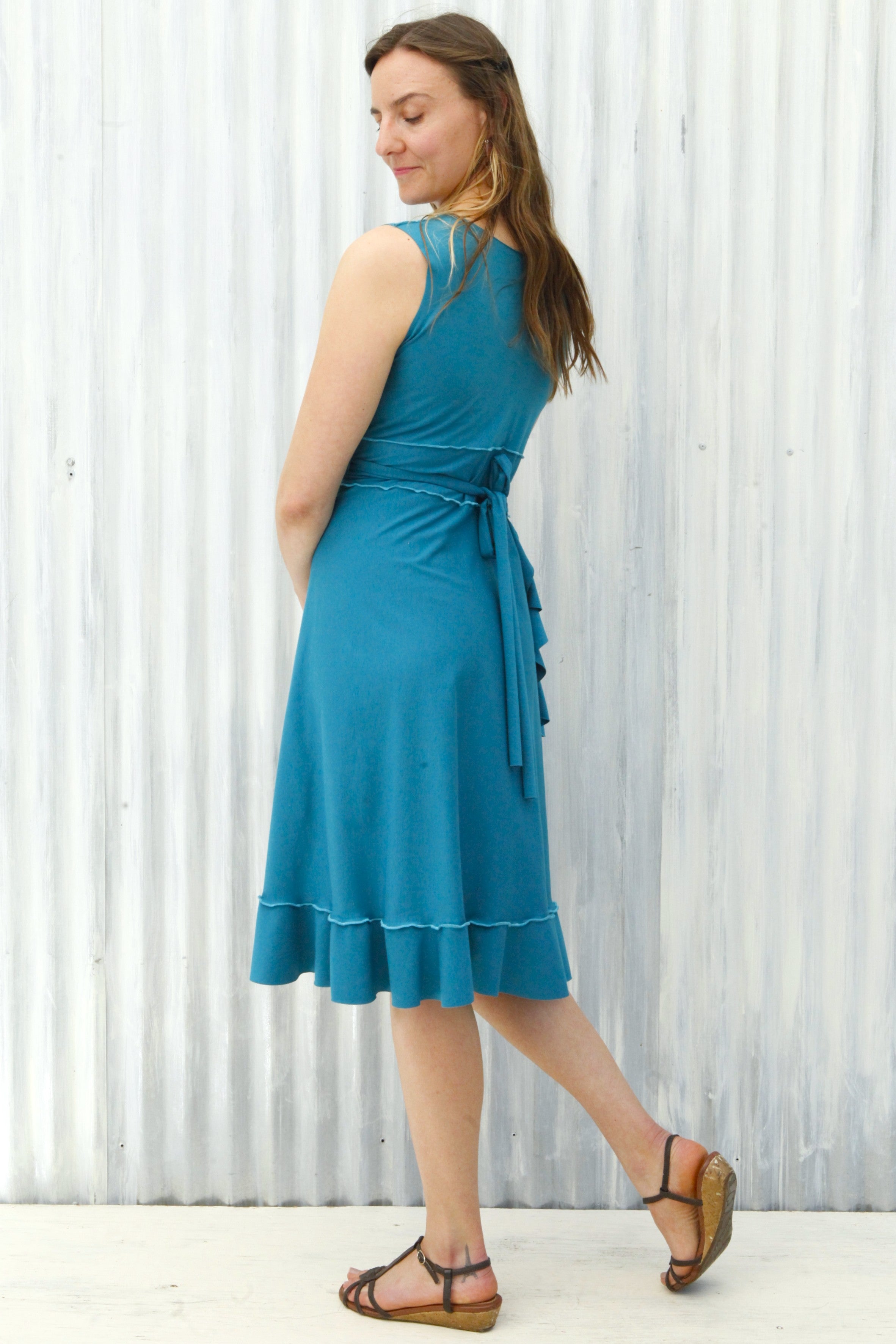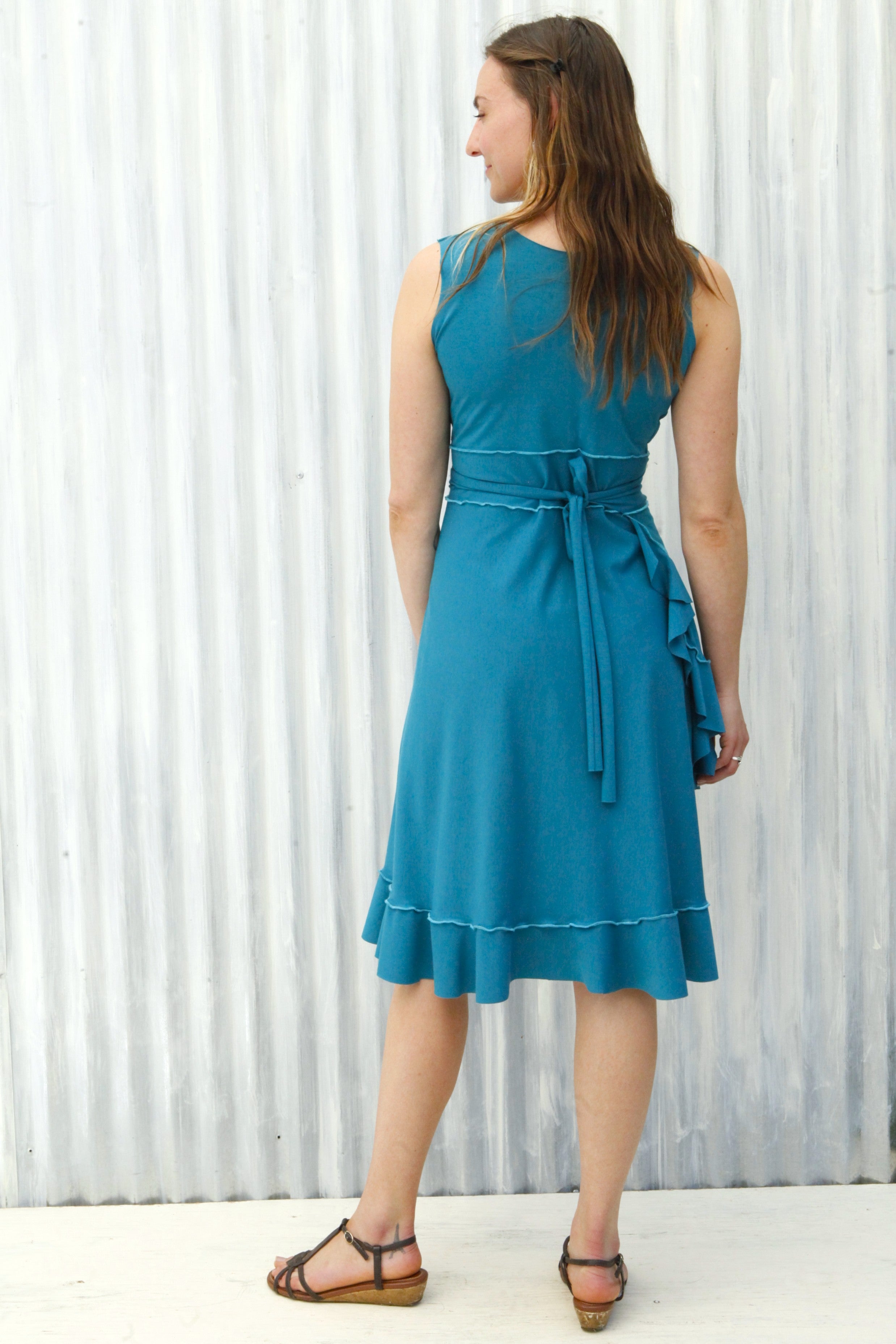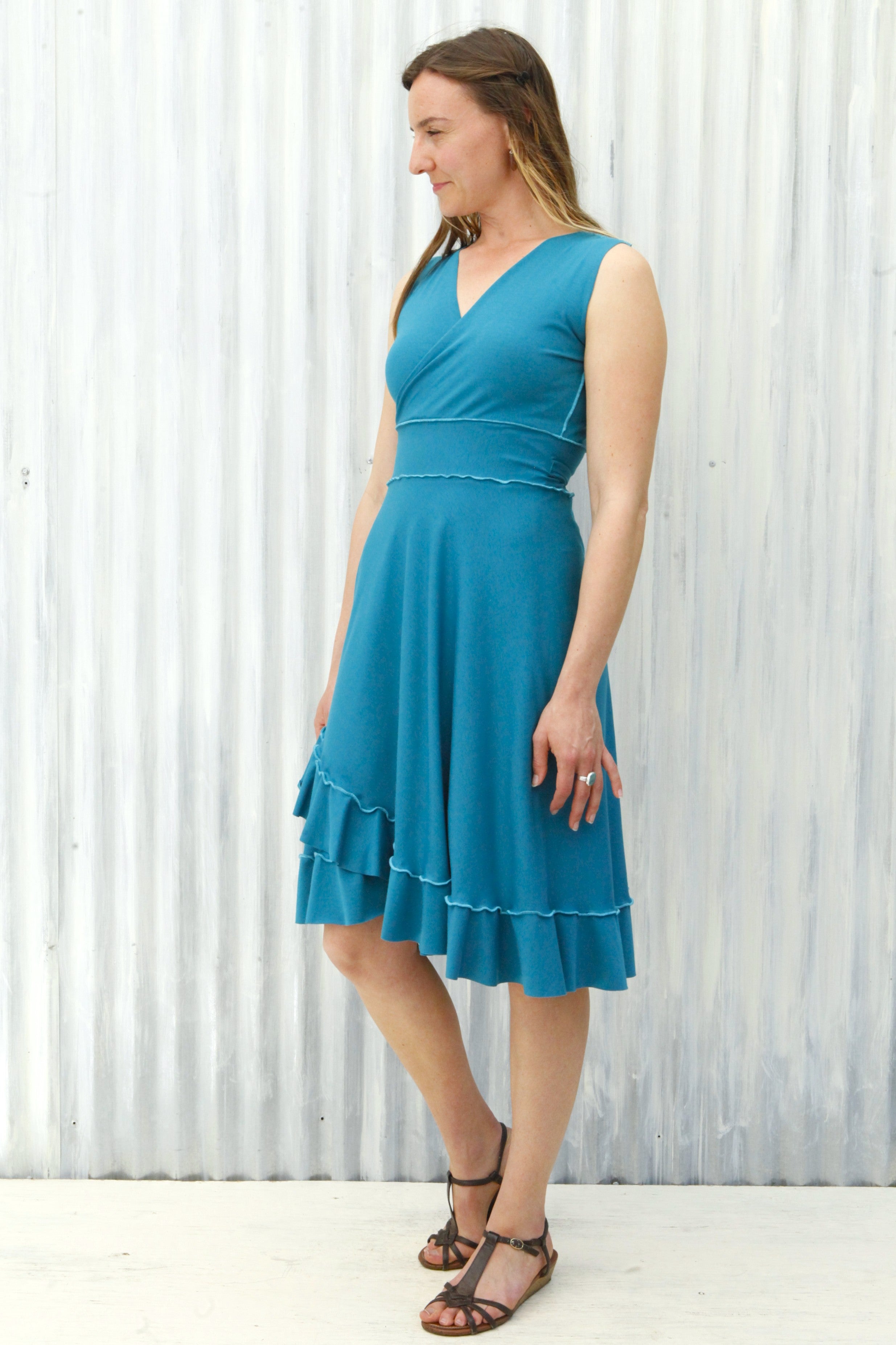 This cute summer dress is so soft and comfortable, it will quickly become your go-to dress for looking great with minimum effort. Perfect for everyday work, play, travel, and stays, it also dresses up quite nicely for fun summer events (especially dance parties!). A longtime favorite Yana Dee design, this style easily fits a wide range of sizes and proportions. With a cute feminine flare, this adjustable ruffled wrap dress is pretty magical in how it can flatter curves without adding too much bulk, or give an hourglass appearance to straighter framed bodies.