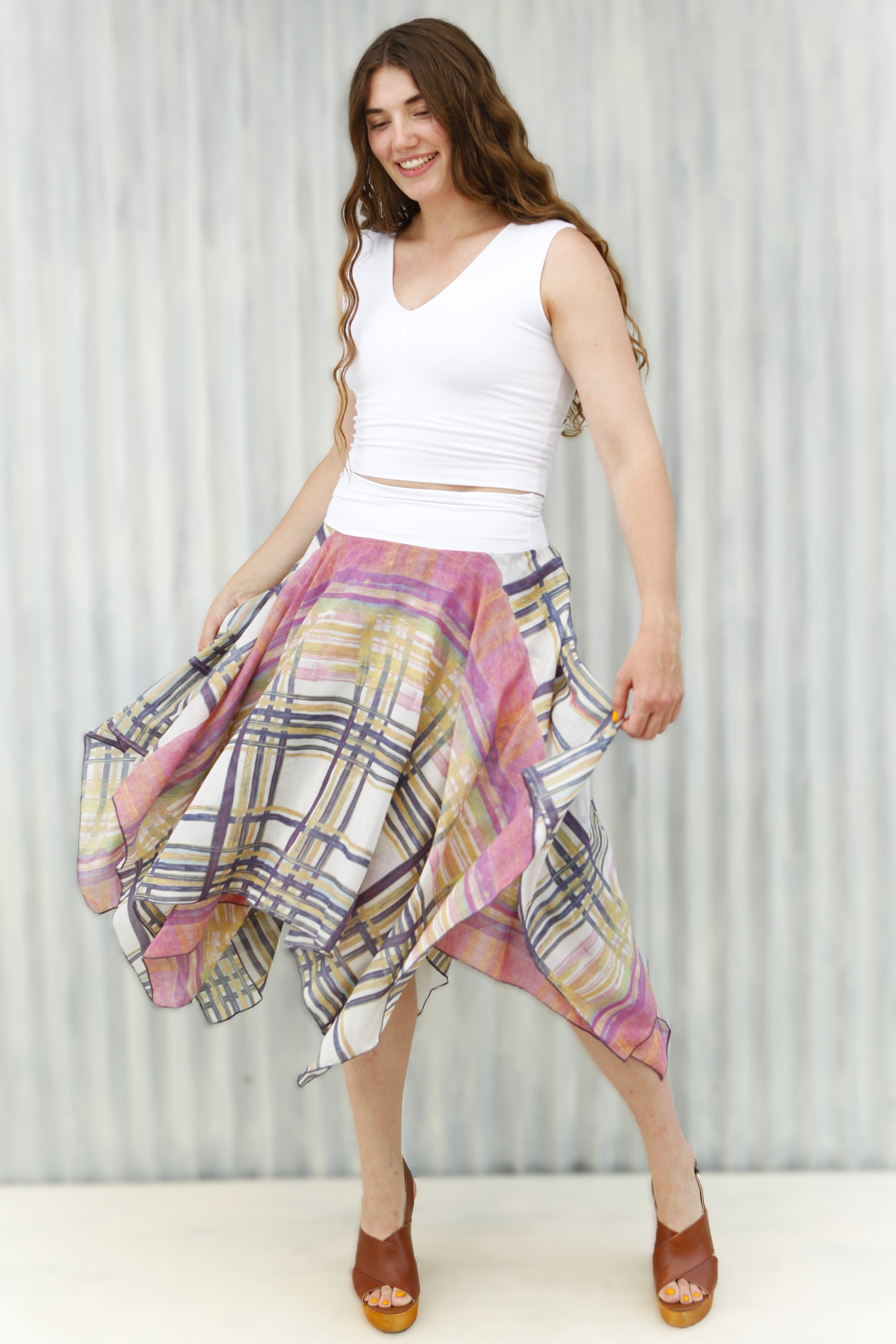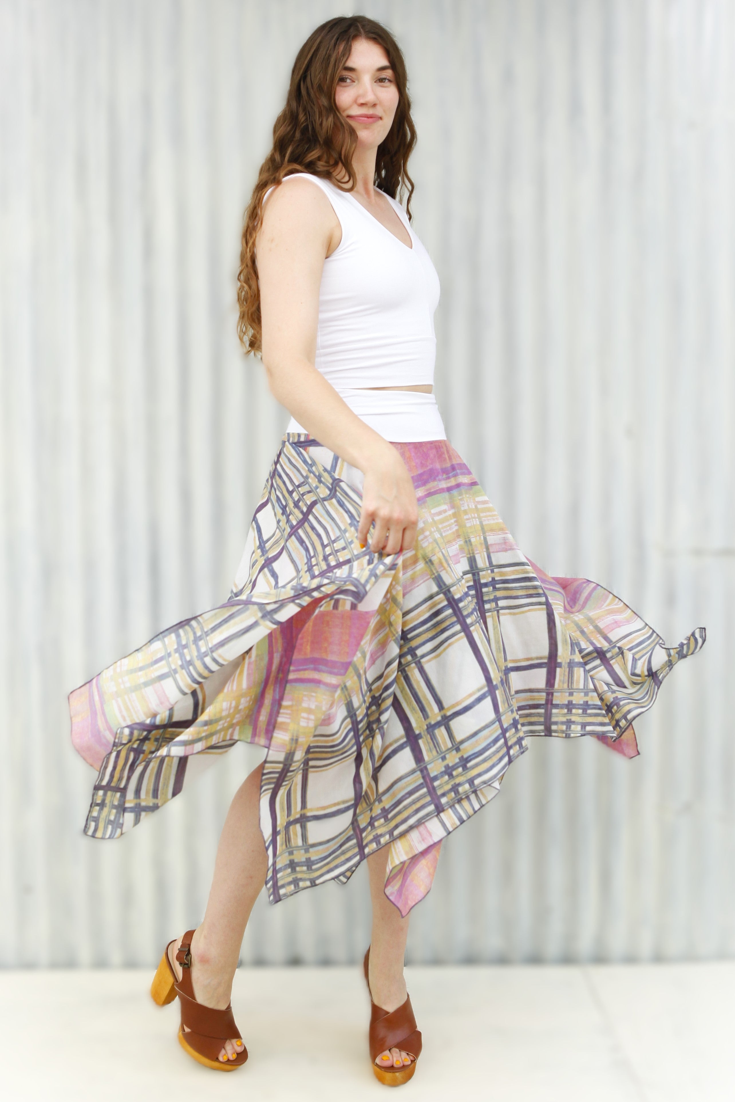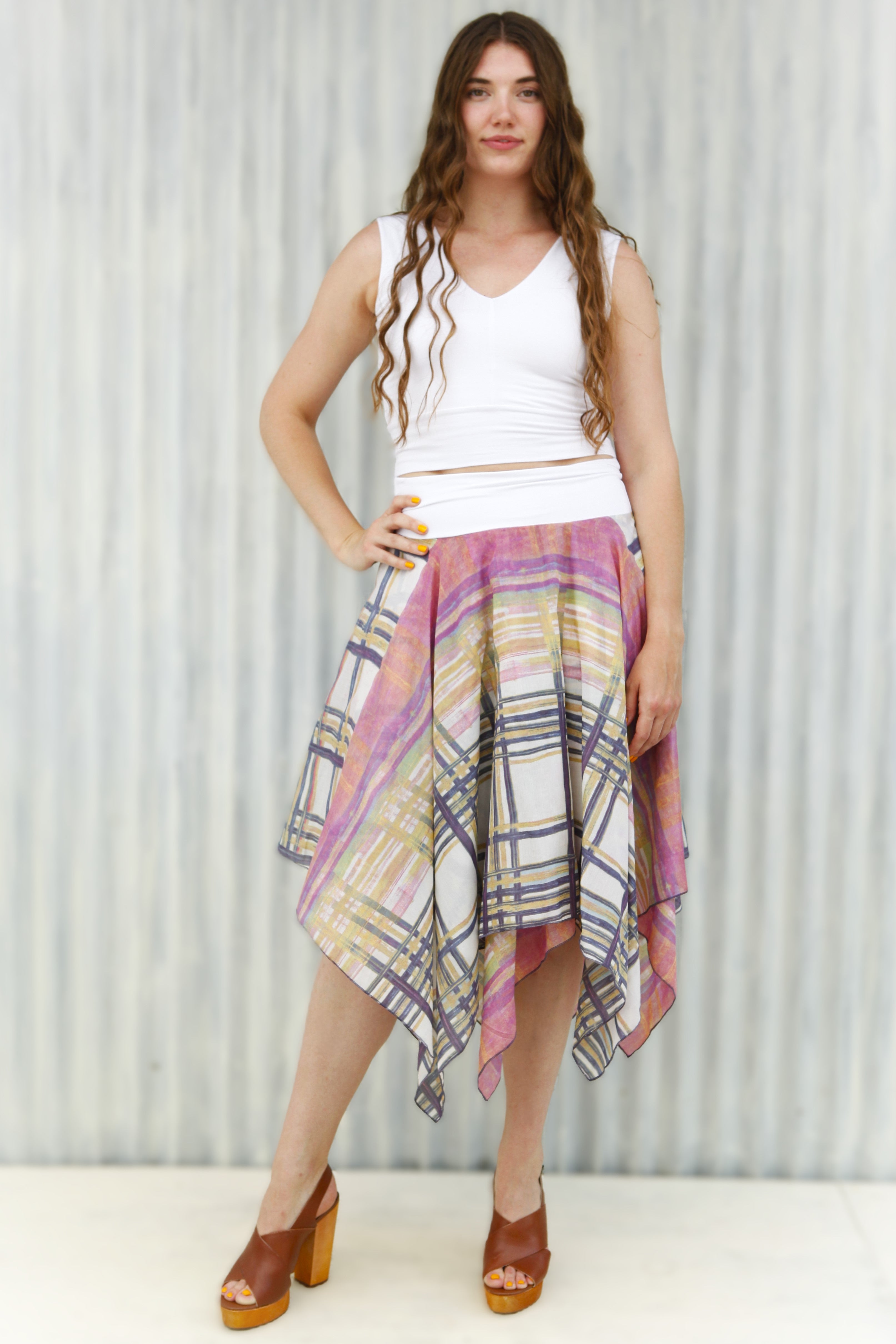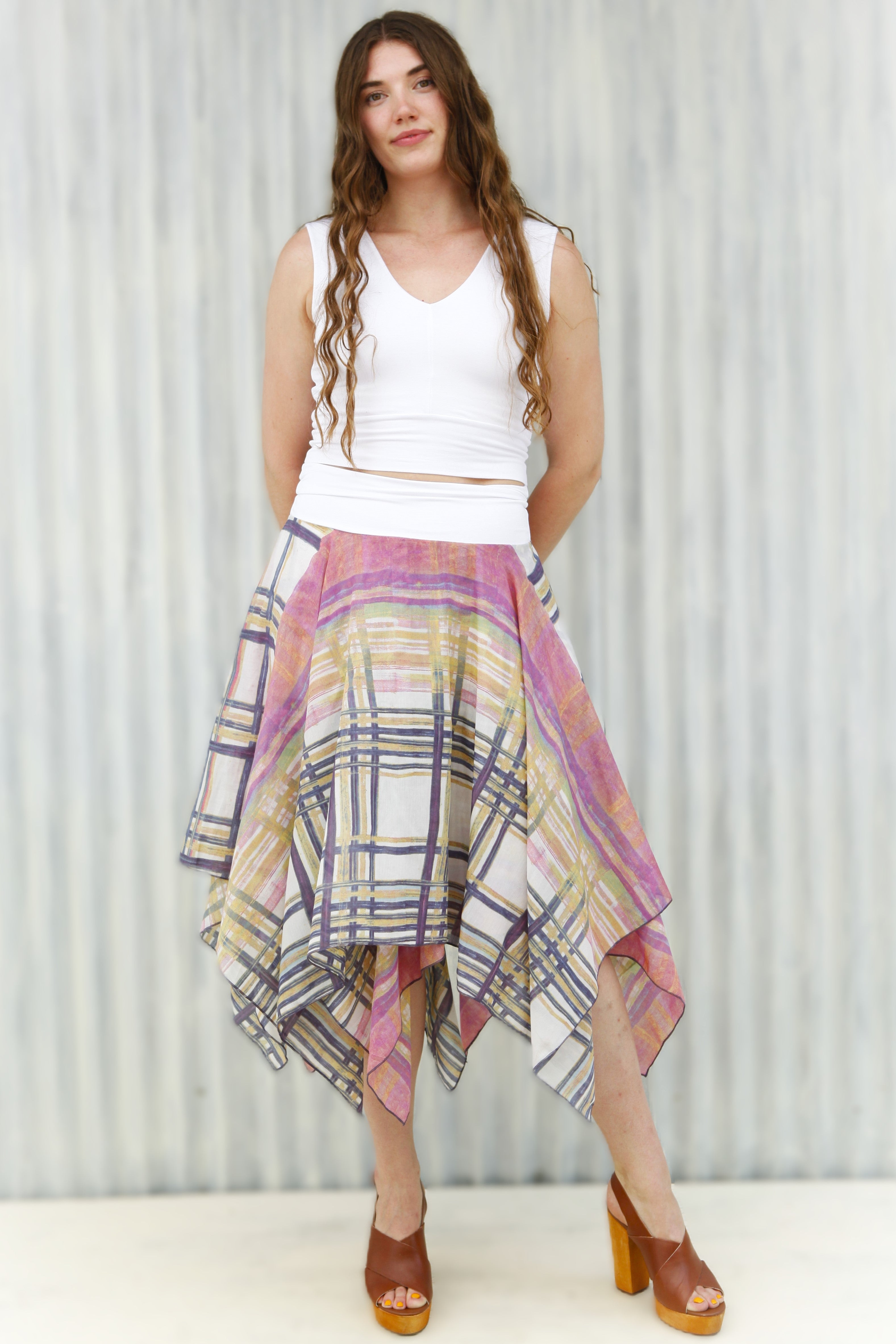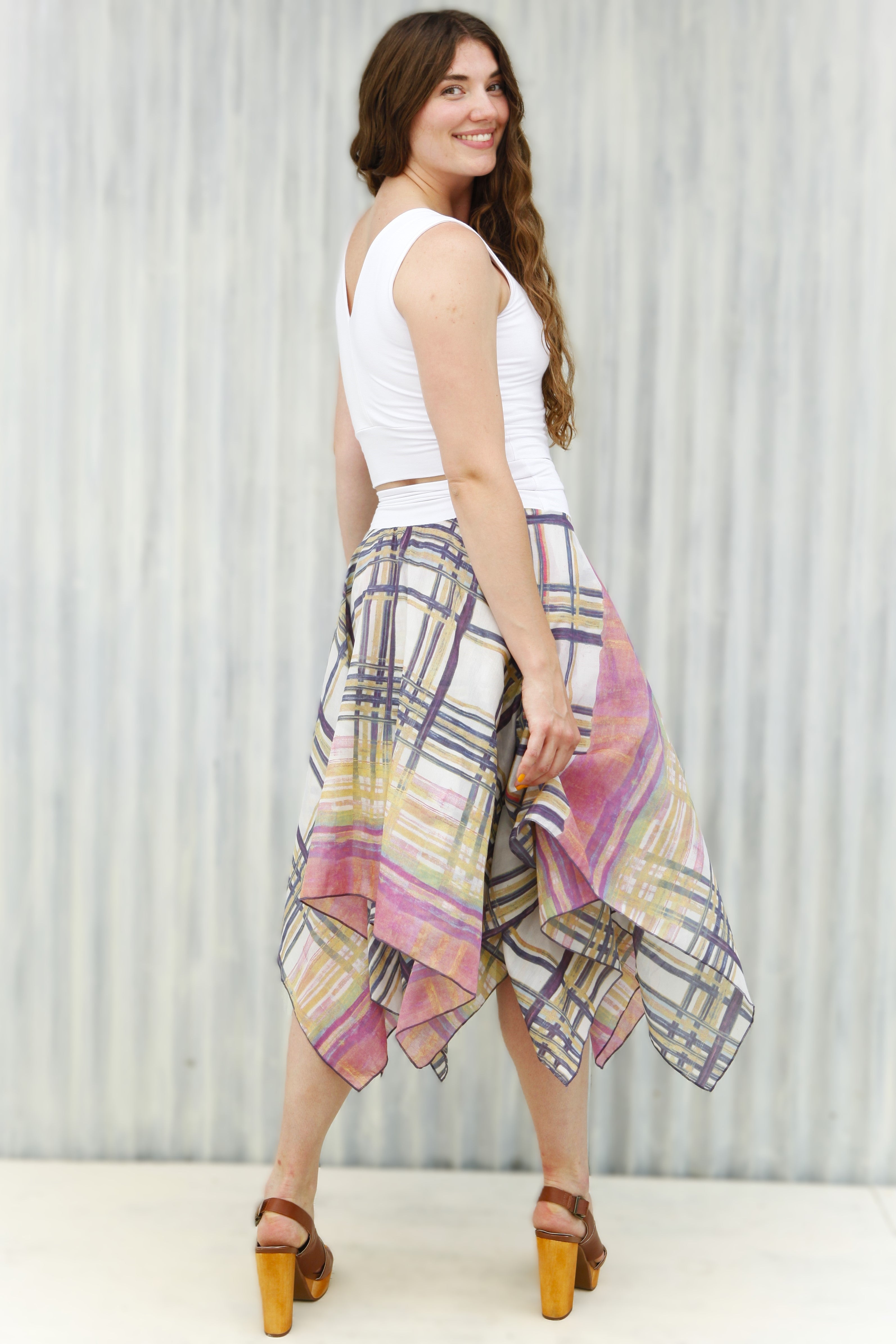 This skirt features an abstract, plaid-adjacent pattern of off-white, pink purplish, and some yellow with a White band.